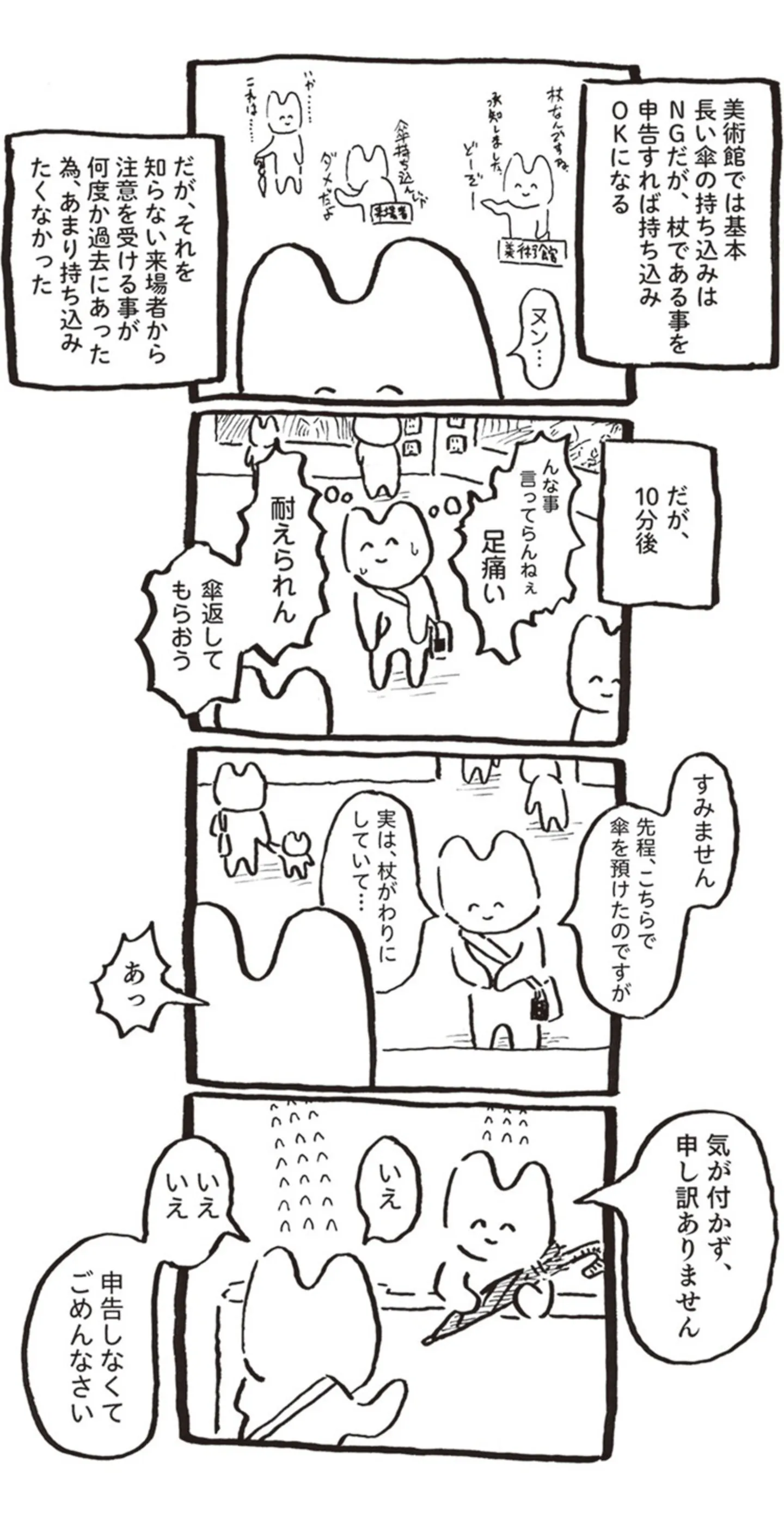 線維筋痛症で出かけるのも一苦労。杖代わりとして傘を持って美術館へ行ったら…/君のためなら生きてもいいかな マンガ 公開日:2025/12/8 この連載を最初から読む→ 私のおでかけ② 私のおでかけ③ 私のおでかけ➃ <第18回に続く> 本作品をAmazon(電子)で読む > 本作品をRenta!で読む > 本作品をebookjapanで読む > 本作品をBOOK☆WALKERで読む > « 1 2 あわせて読みたい 【漫画】『君のためなら生きてもいいかな ハムスターのうにさんと私』を第1回から読む 【漫画】『世界で一番嫌いな女』を読む 【漫画】『残業地獄のねこが転職するまでの120日間の記録』を読む 【漫画】『思いつき無職生活 職なしガールの残念だけど悪くない日々』を読む 【漫画】『会社がツライ なりたい自分を見つけるまで』を読む 最新マンガと話題の書籍を無料で試し読み! 前の回 一覧 人気の連載 次の回 君のためなら生きてもいいかな ハムスターのうにさんと私【電子特典付き】 試し読み *電子書籍ストアBOOK☆WALKERへ移動します