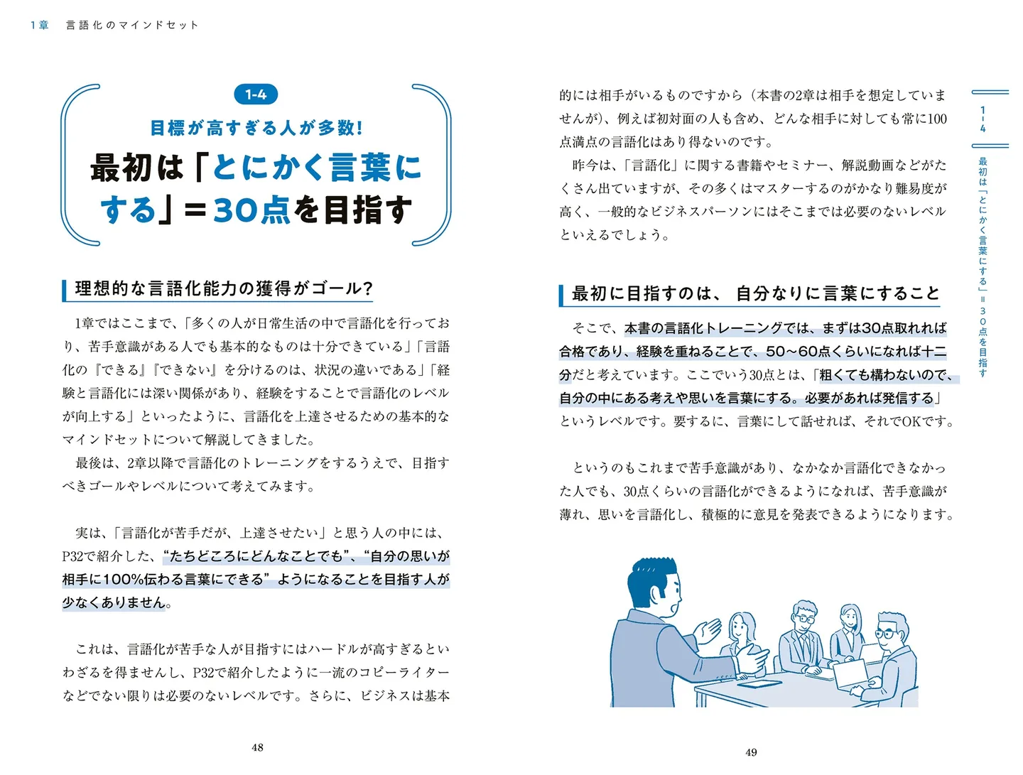 では、どうしてビジネスシーンでは言いたいことを上手く言葉にできないのかといえば、それはそこに「完璧な意見を言わなければならない」というプレッシャーや「これを言ったら、どう思われるだろう」という他者への過剰な配慮があるからだ。そこで、この本では、「言語化ができない」という思い込みをなくし、「まずは30点でいいから、とにかく言葉にしてみる」というマインドセットを身につける。そして、さまざまな思考法を、具体的なトレーニングとともに実践していくのだ。
