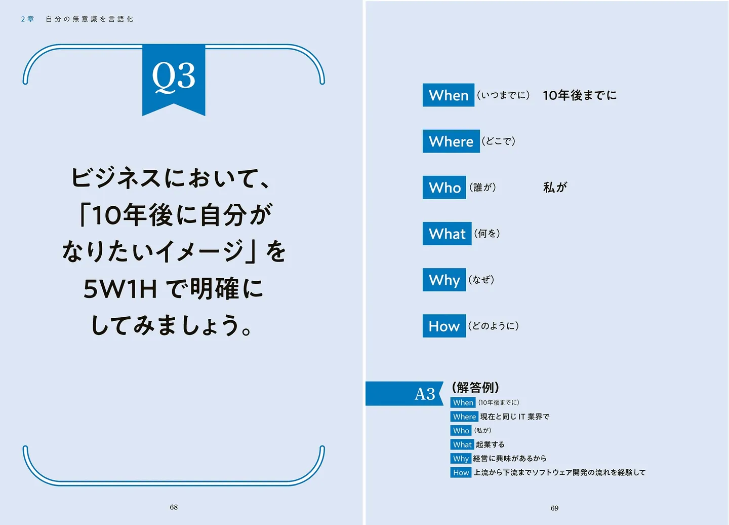 明確なことを言語化できるようになったら、今度は頭の中でぼんやり思い描いたものの言語化。たとえば、「10年後に自分がなりたいイメージ」を、「When(いつ)」「Where(どこで)」「Who(誰が)」「What(何を)」「Why(なぜ)」「How(どのように)」の5W1Hで整理する。