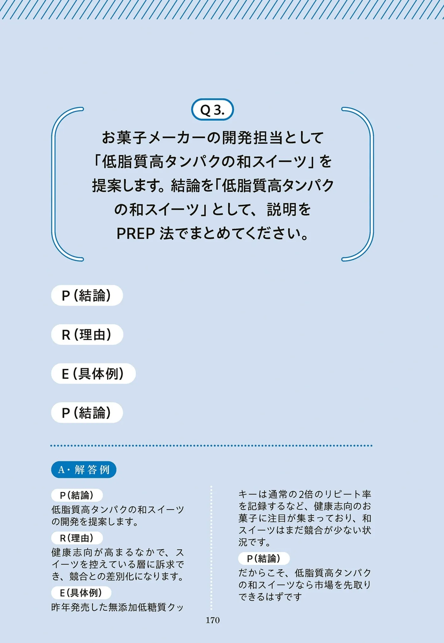 上司に「今期取り組みたいことを1on1までに考えて」と言われた時、現在の業務に尽力し、営業先も開拓したいことを明確に伝えるためにはどうするか。お菓子メーカーの開発担当として「低脂肪高タンパクの和スイーツ」を提案する時、どう説明するか――本書には、たくさんのワークがあり、それを起点に言語化の方法を身につけられるのがいい。