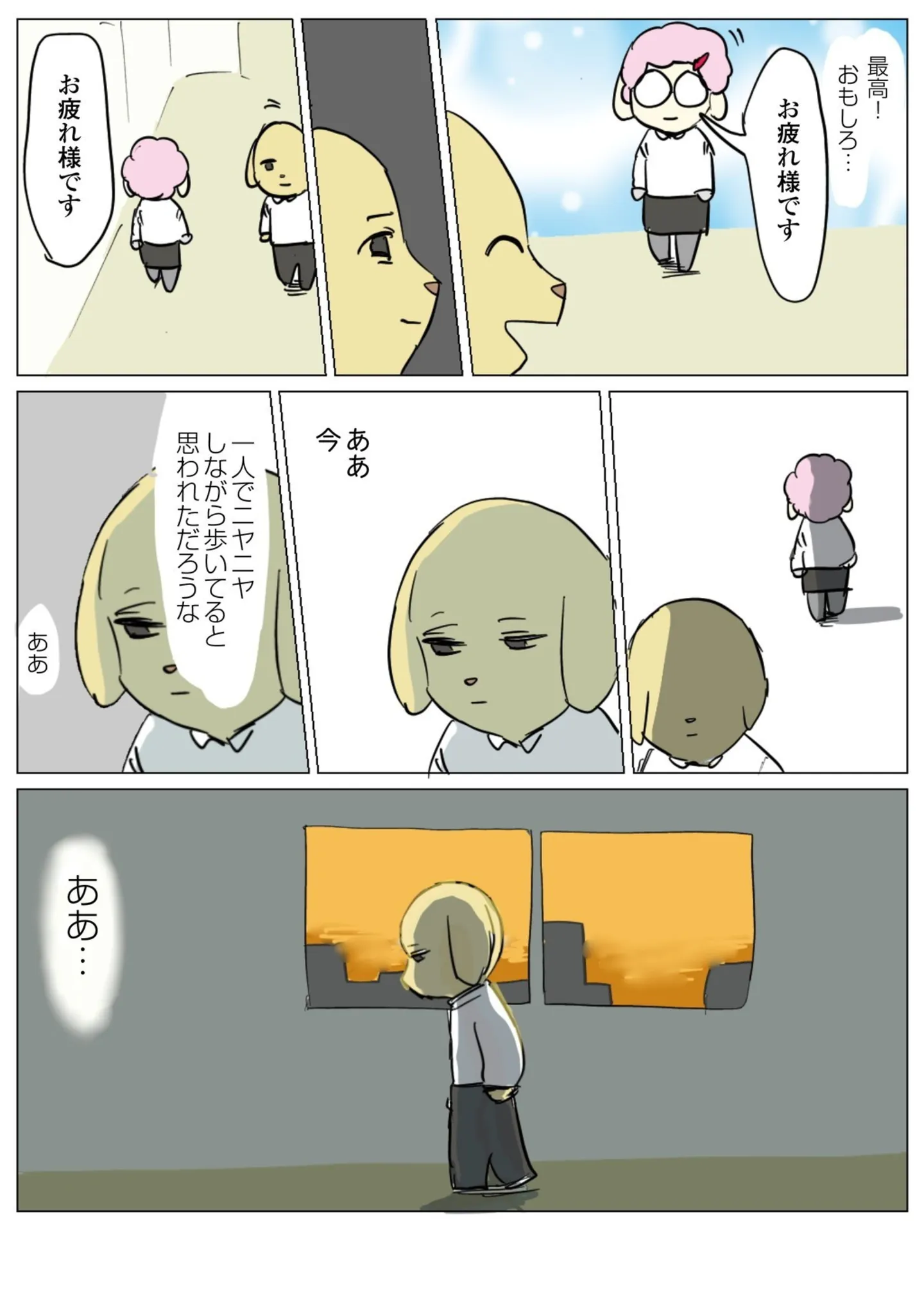 後輩との会話を思い出して、ひとり笑顔に。そのまま同僚とすれ違ってしまい…/働く!くよくよ犬㉓