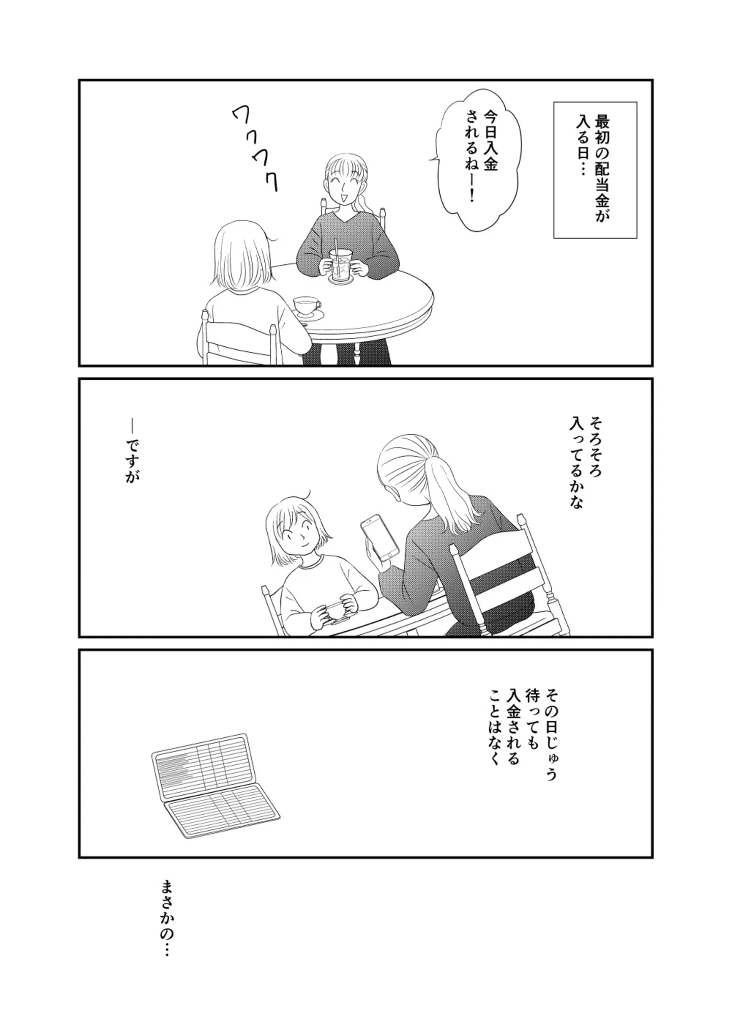 50万円預けて毎月5万円の配当金がもらえる。夢のような投資話を信じてお金を預けてみると/100万円、預けた先は“詐欺”でした。⑧ マンガ 公開日:2026/1/1 この連載を最初から読む→ <第9回に続く> « 1 2 3 4 5 あわせて読みたい 【漫画】『100万円、預けた先は“詐欺”でした。』を読む 予定通り値上がりせず、投資コミュニティへの不信感が膨れ上がる。付き合いから抜け出せないまま急展開に/100万円、預けた先は“詐欺”でした。⑦ 「仕事で必要になるはず」突然の投資話に動揺。運がいいねと言われたけれど…/100万円、預けた先は“詐欺”でした。① 誠実そうな男性が語る“うさんくさい”投資話。この投資、本当に信じていいの?/100万円、預けた先は“詐欺”でした。② 30万円投資した人気漫画家がカルチャーショック、投資界隈の“あるある”とは?/100万円、預けた先は“詐欺”でした。③ 最新マンガと話題の書籍を無料で試し読み! 前の回 一覧 人気の連載 次の回