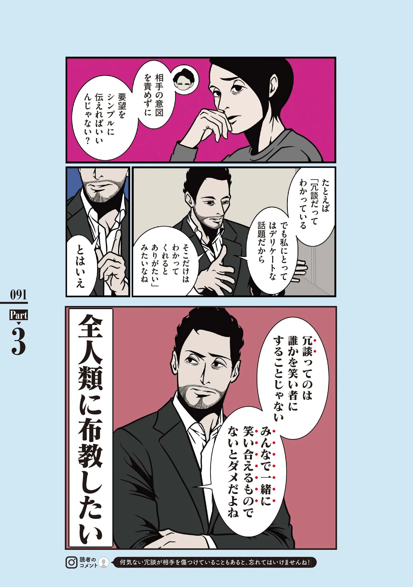 誰かを笑い者にするのが冗談じゃない。モヤモヤを解消した夫の言葉/全てのネガティブをプラスに変える夫 髭「人生満点じゃなくてもはなまるだ」編 マンガ 公開日:2025/12/18 この連載を最初から読む→ <第4回に続く> 本作品をAmazon(電子)で読む > 本作品をebookjapanで読む > 本作品をブックライブで読む > 本作品をBOOK☆WALKERで読む > « 1 2 3 あわせて読みたい 【漫画】『全てのネガティブをプラスに変える夫 髭「人生満点じゃなくてもはなまるだ」編』を第1回から読む 【漫画】『全てのネガティブをプラスに変える夫 髭「NGと書いてナイスガイと読む」編』を読む 【漫画】『勤労ロードショー 今日も財布がさみしくて』を読む 【漫画】『ある日突然オタクの夫が亡くなったら?』を読む 【漫画】『今日から別居します 産んだら夫を嫌いになりました』を読む 最新マンガと話題の書籍を無料で試し読み! 前の回 一覧 人気の連載 次の回 全てのネガティブをプラスに変える夫 髭「人生満点じゃなくてもはなまるだ」編【電子版特典付き】 試し読み *電子書籍ストアBOOK☆WALKERへ移動します 全てのネガティブをプラスに変える夫 髭「NGと書いてナイスガイと読む」編 試し読み *電子書籍ストアBOOK☆WALKERへ移動します 全てのネガティブをプラスに変える夫 髭「さては人生3周目だな」編 試し読み *電子書籍ストアBOOK☆WALKERへ移動します