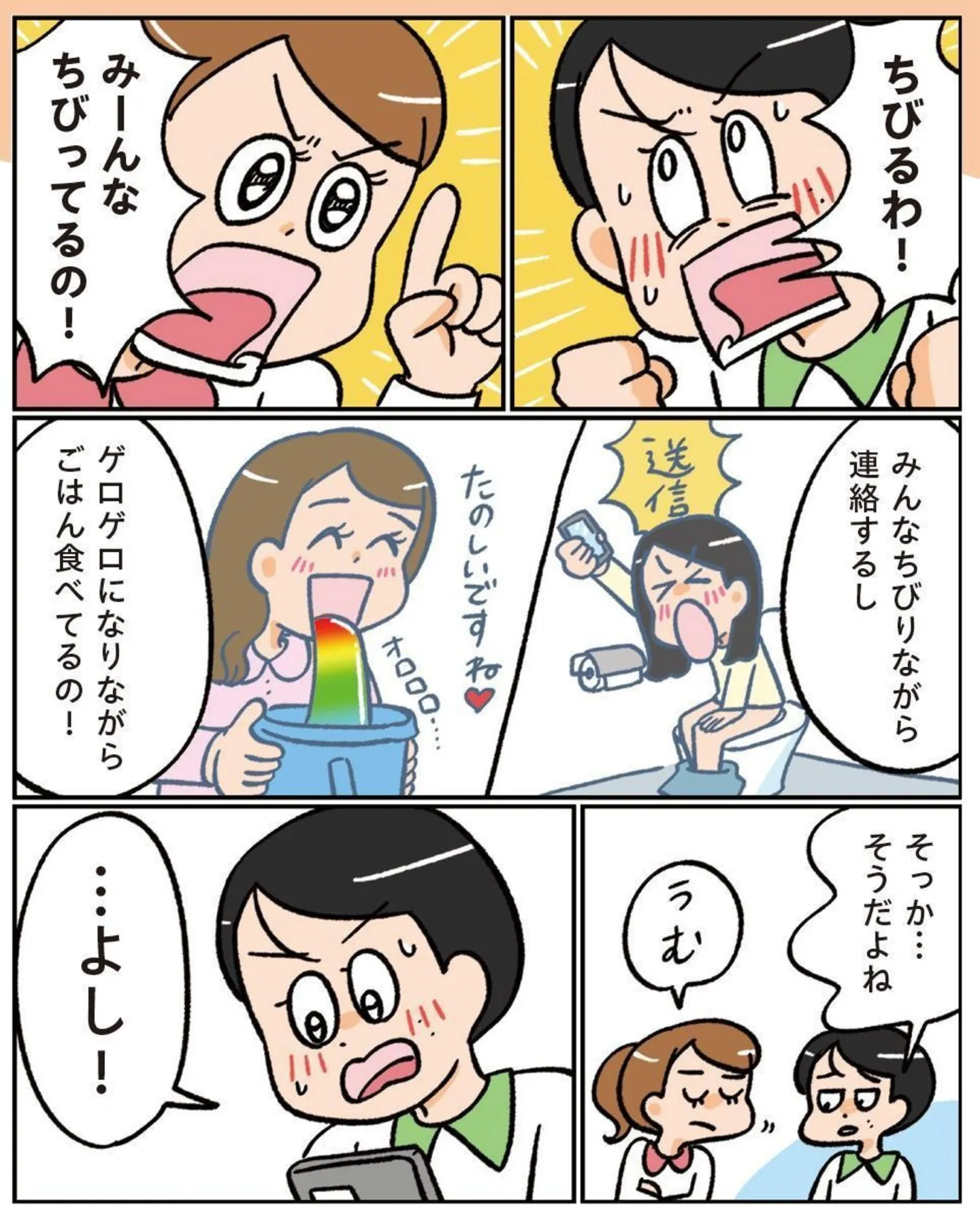読みながらパチンと心の迷いが解けたような気がしたのは、作者の潤奈さんとお姉さんが登場するエピソード。「アンモニア色の片思い」というお話です。好きな人になかなか連絡できない潤奈さん。思わず口にしたのは、「ちびるわ!」という赤裸々な思いでした。
