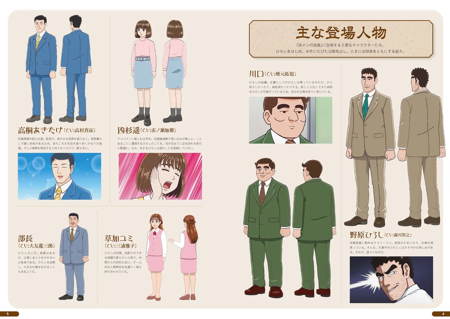 次に「各話エピソード紹介」。1話分のエピソードを見開きで紹介するこのページは、単なるあらすじではなく、実際のアニメの画面にテキストを合わせた、フィルムコミックのような読み物になっている。“意識だけは高い”川口のおかしさがいかんなく発揮されている「ビリヤニの流儀」回や、聞こえてくるすべての言葉を自分に向けられたものだと受け取ってしまう四杉の、激しい思い込みが炸裂する「イカスミパスタの流儀」回は、ページを読むだけで笑ってしまう。たとえば、遥は妄想する頭の中で、ひろしをサラリーマンではなくメタル風バンドマン姿にまで仕立て上げてしまうのだ……。