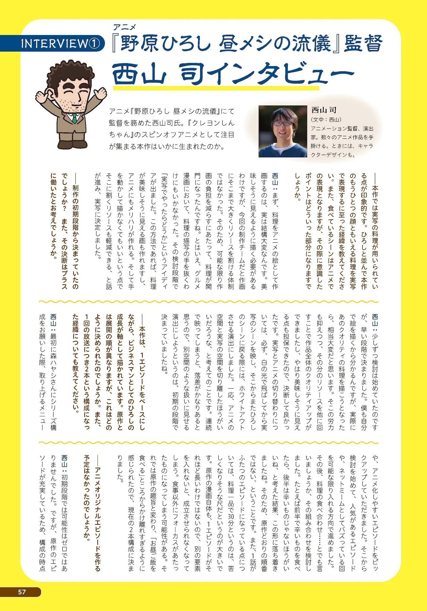 そして、野原ひろし役の森川智之氏と『野原ひろし 昼メシの流儀』監督の西山司氏のインタビューが続く。森川氏は、渋い声で決めるシーンからギャグシーンまで本家『クレヨンしんちゃん』以上(に感じる)の熱演について語り、西山監督は、料理を実写にした理由と料理写真をアニメに馴染ませるこだわり、そしてひろし以外のキャラクターたちの出番を増やした理由や、彼らが脚本、声優、原作者の力で原作コミック以上に“激しく”なったことについて、たっぷりと語っている。たとえば、遥はマンガよりもやりすぎなくらい思い込みが激しいキャラクターに仕上がっているそうで、特に「叫び声の演技が素晴らしかった」と語っている。