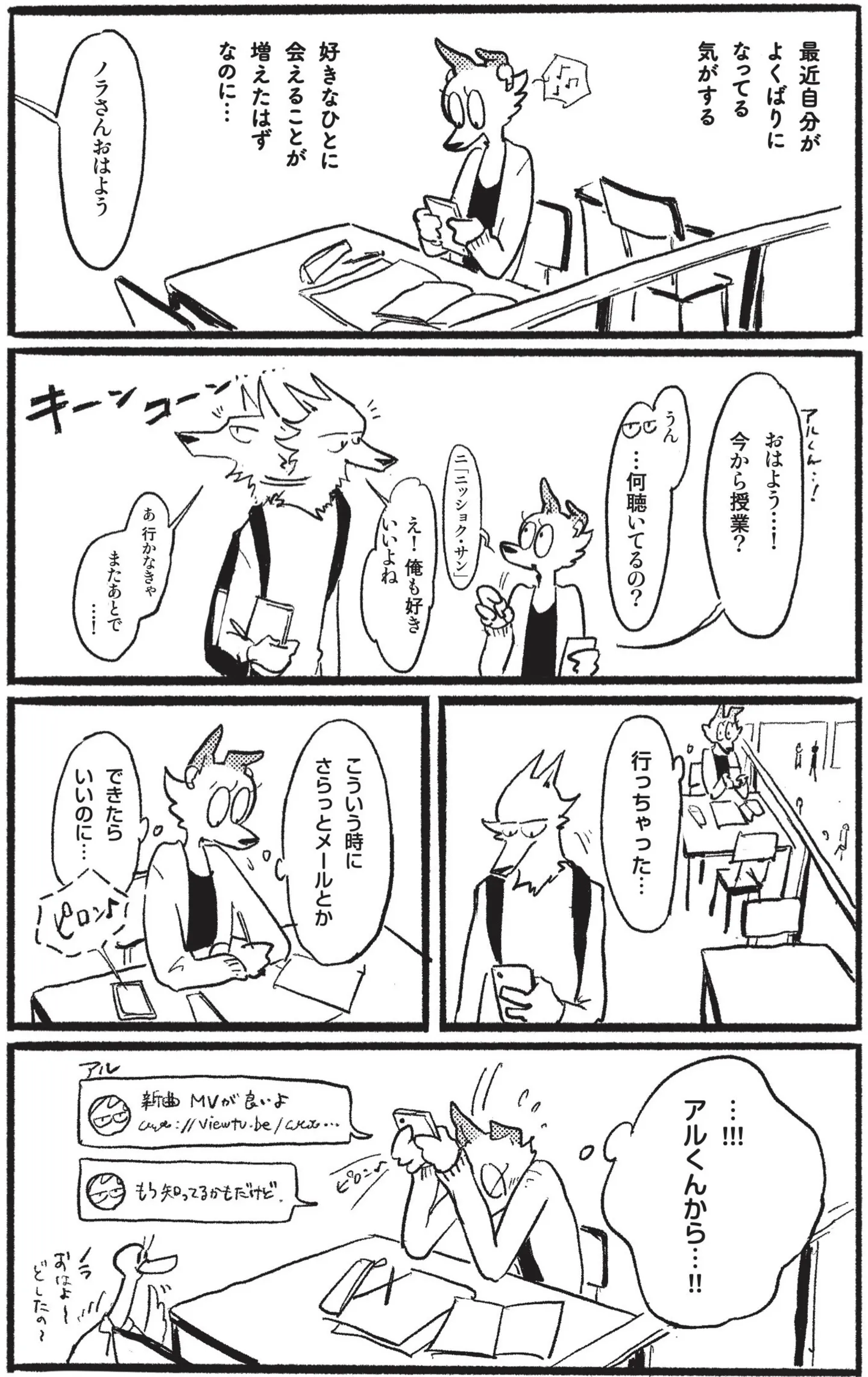 気軽に連絡ができたらな…好きな人と会う機会が増え、欲張りになっていることに気づく/おもいこみのノラ④ マンガ 公開日:2025/12/20 この連載を最初から読む→ 『おもいこみのノラ』(蒔/KADOKAWA)第4回【全8回】 モテる人を好きになってしまった…こんな私じゃ、きっとダメだよね。折れた耳がチャームポイントの雑種犬・ノラは、人気者でモテ男のオオカミ・アルに恋をする。「今日は会えるかな…」寝ても覚めてもアルに夢中のノラ。一方、アルにも気になる人がいて――? 切なさと愛しさが胸にじんわり広がる、甘酸っぱい獣人群像劇『おもいこみのノラ』をお楽しみください! 【30日間無料】Amazonの読み放題をチェック > 気持ちとよくばりが比例していく 本作品をAmazon(電子)で読む > 本作品をRenta!で読む > >> 次のページに続く 1 2 > あわせて読みたい 【漫画】『おもいこみのノラ』を第1回から読む 【漫画】『娘を妊娠させたのは誰ですか?』を読む 【漫画】『飼い猫がなつきません 』を読む 最新マンガと話題の書籍を無料で試し読み! 前の回 一覧 人気の連載 次の回 おもいこみのノラ (コミックエッセイ) 試し読み *電子書籍ストアBOOK☆WALKERへ移動します