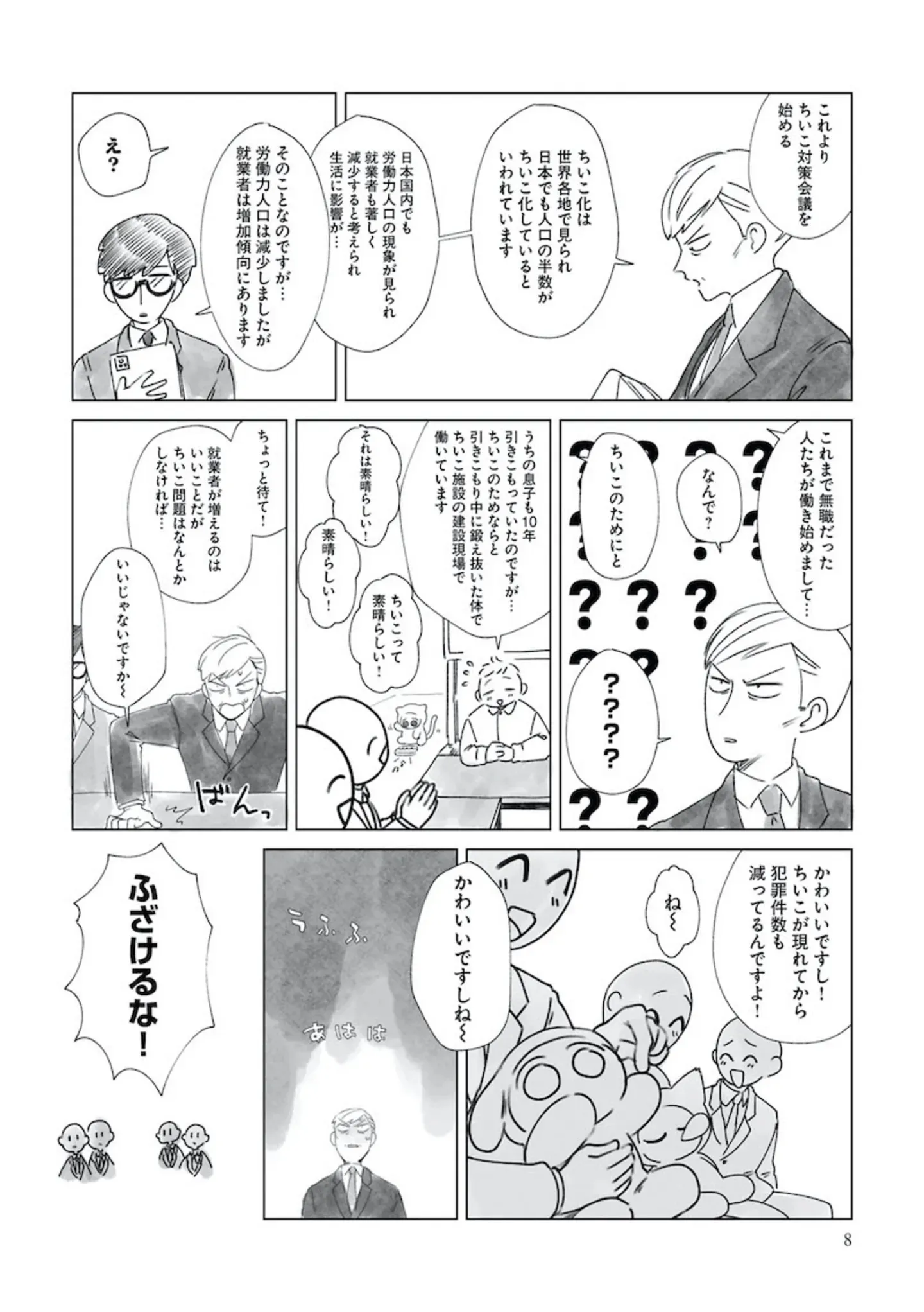 人類の半数が謎のかわいい生き物になり緊急会議。対策本部で深刻な議論をするはずが…/人類の半数がちいこになった1② マンガ 公開日:2025/12/14 この連載を最初から読む→ <第3回に続く> 本作品をAmazon(電子)で読む > 本作品をRenta!で読む > 本作品をebookjapanで読む > 本作品をBOOK☆WALKERで読む > « 1 2 あわせて読みたい 【漫画】『人類の半数がちいこになった(1~2巻)』を第1回から読む 【漫画】『痔だと思ったら大腸がんステージ4でした 標準治療を旅と漫画で乗り越えてなんとか経過観察になるまで』を読む 【漫画】『愛され女子でスミマセン』を読む 最新マンガと話題の書籍を無料で試し読み! 前の回 一覧 人気の連載 次の回 人類の半数がちいこになった (MFC) 試し読み *電子書籍ストアBOOK☆WALKERへ移動します 人類の半数がちいこになった 2 (MFC) 試し読み *電子書籍ストアBOOK☆WALKERへ移動します