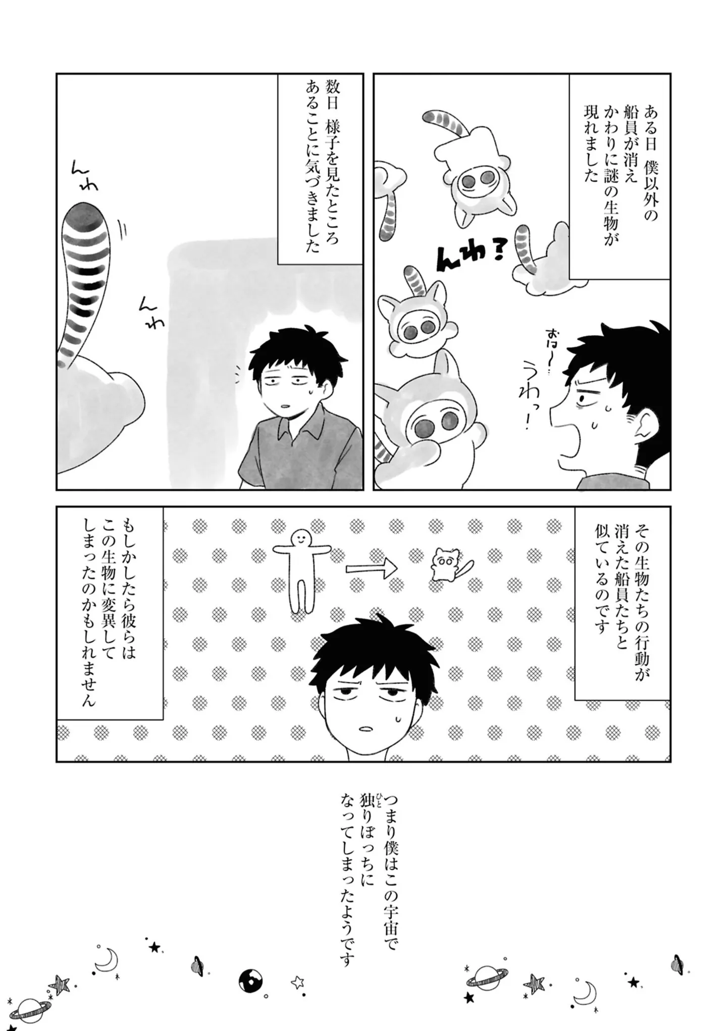 自分以外の船員が不思議な生き物になってしまい…。宇宙船に残された男性の孤独と絶望/人類の半数がちいこになった2⑬ マンガ 公開日:2025/12/25 この連載を最初から読む→ <第14回に続く> 本作品をAmazon(電子)で読む > 本作品をRenta!で読む > 本作品をebookjapanで読む > 本作品をBOOK☆WALKERで読む > « 1 2 あわせて読みたい 【漫画】『人類の半数がちいこになった(1~2巻)』を第1回から読む 【漫画】『サレた私は夫の墓へ』を読む 【漫画】『人見知りの自分を許せたら生きるのがラクになりました』を読む 最新マンガと話題の書籍を無料で試し読み! 前の回 一覧 人気の連載 次の回 人類の半数がちいこになった (MFC) 試し読み *電子書籍ストアBOOK☆WALKERへ移動します 人類の半数がちいこになった 2 (MFC) 試し読み *電子書籍ストアBOOK☆WALKERへ移動します