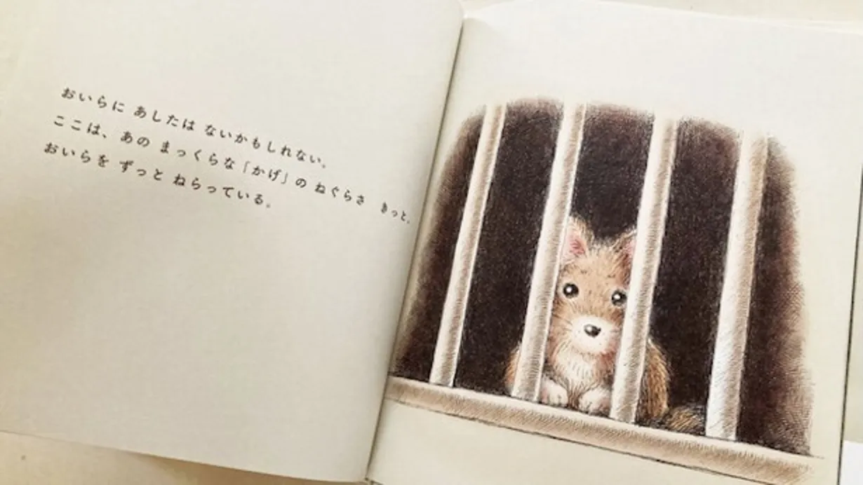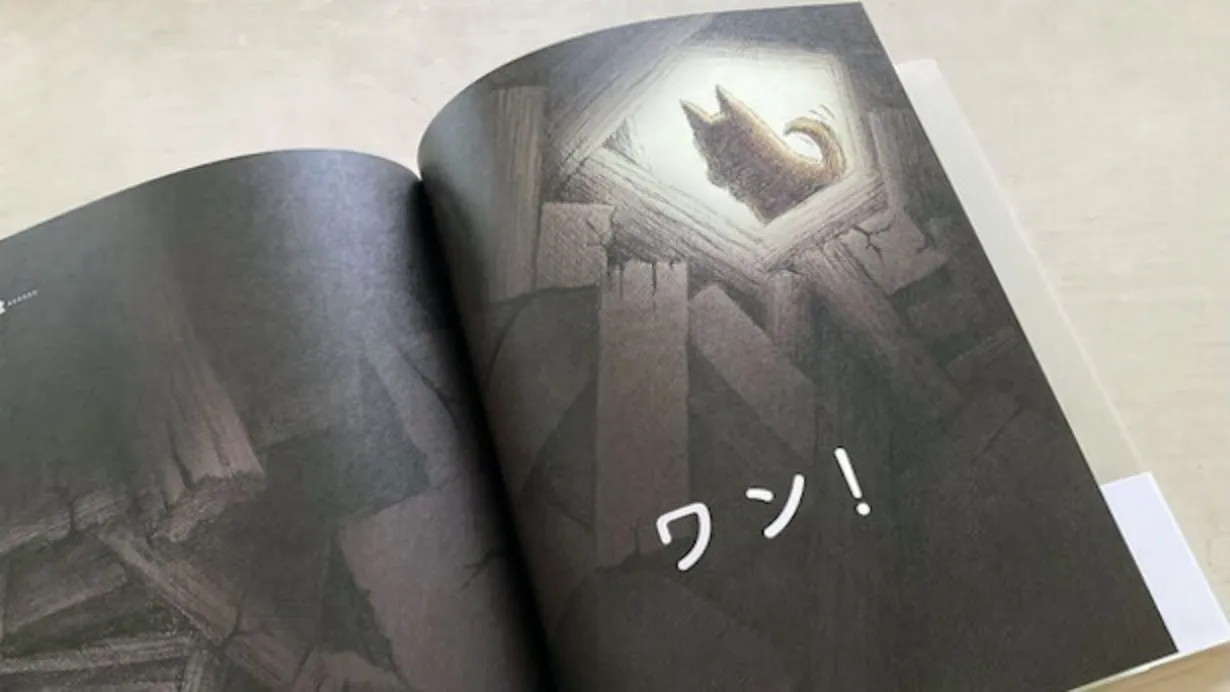絵本を作る際、“犬の視点”であることを強く意識して描いていました。そのため、犬らしい感性が所々の表現に現れているかと思います。例えば保健所を表現する「ここは、あのまっくらな『かげ』のねぐらさ」や、地震を表現する「じめんが いろんないきものの 『あした』を たべた」など。「犬の視点で描く」ということを徹底し、人間の視点からは生まれない表現を使ってみました。