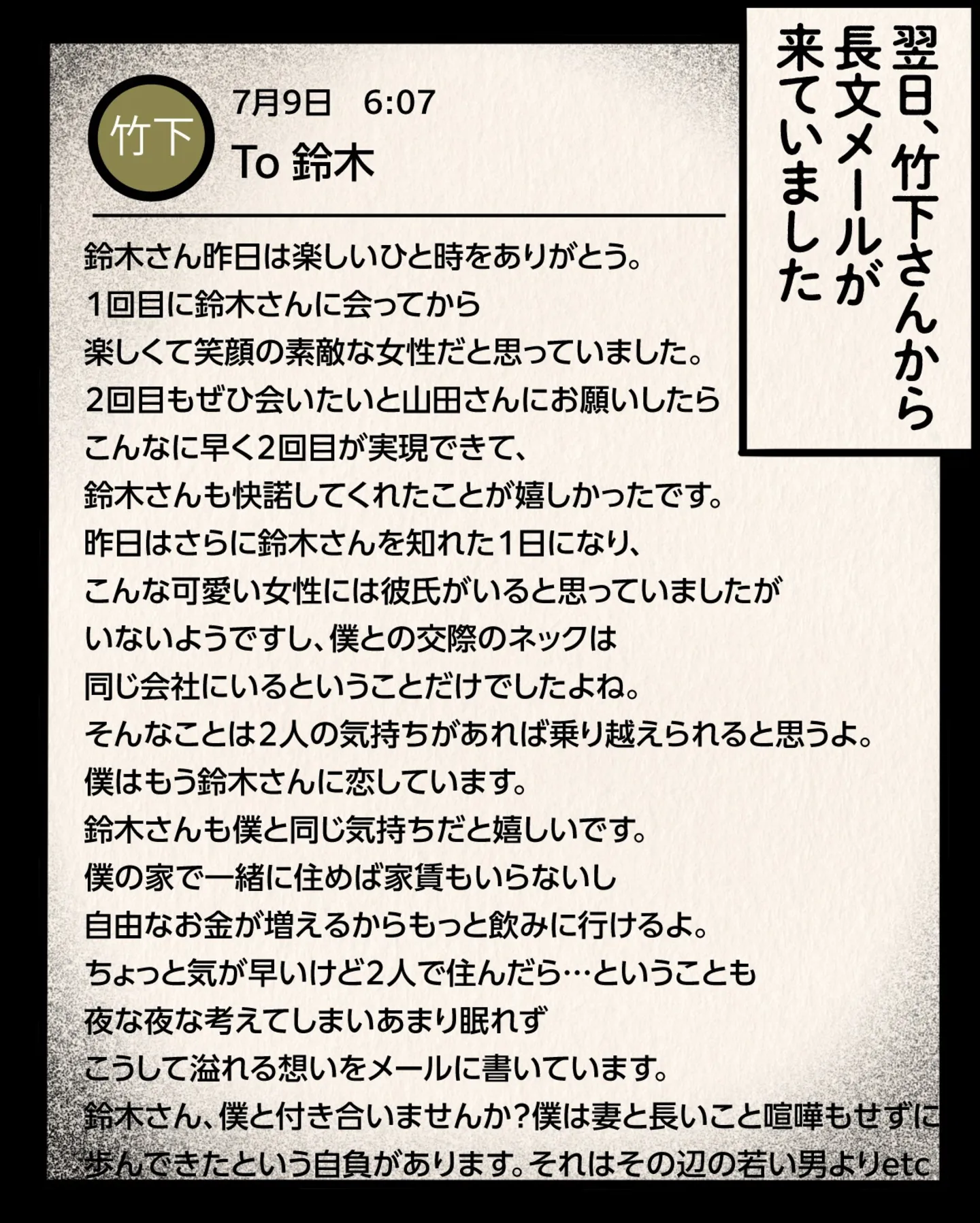 「僕との交際のネックは同じ会社にいるということだけ」2回しか会ったことのない、20歳年上の男性から届いた長文メール/身の毛がよだつゾッとした話 マンガ 公開日:2026/1/7 この連載を最初から読む→ 本作品をAmazon(電子)で読む > 本作品をDMMブックスで読む > >> 次のページに続く « 1 2 3 > あわせて読みたい 【漫画】『身の毛がよだつゾッとした話』を読む 5年前に病気で妻を亡くしたという男性。部屋中に亡くなった奥さんの写真が飾られている中で…/身の毛がよだつゾッとした話 【漫画】『その物件、告知事項アリ』を読む 【漫画】『死役所』を読む 【漫画】『東京怪奇酒』を読む 『夏にひんやり 怪談・ホラー特集』を読む! 前の回 一覧 人気の連載 次の回 身の毛がよだつゾッとした話 (コミックエッセイ) 試し読み *電子書籍ストアBOOK☆WALKERへ移動します