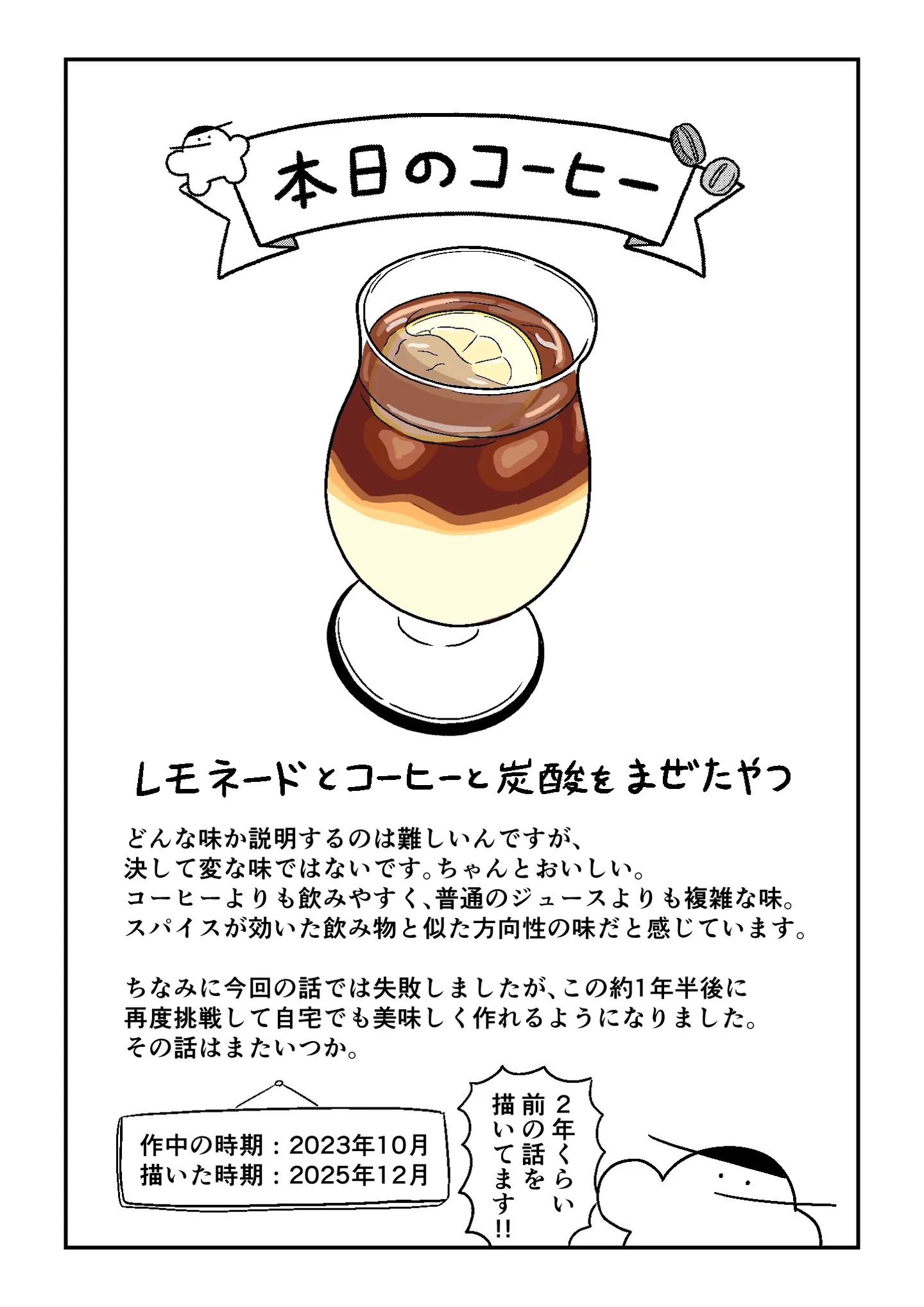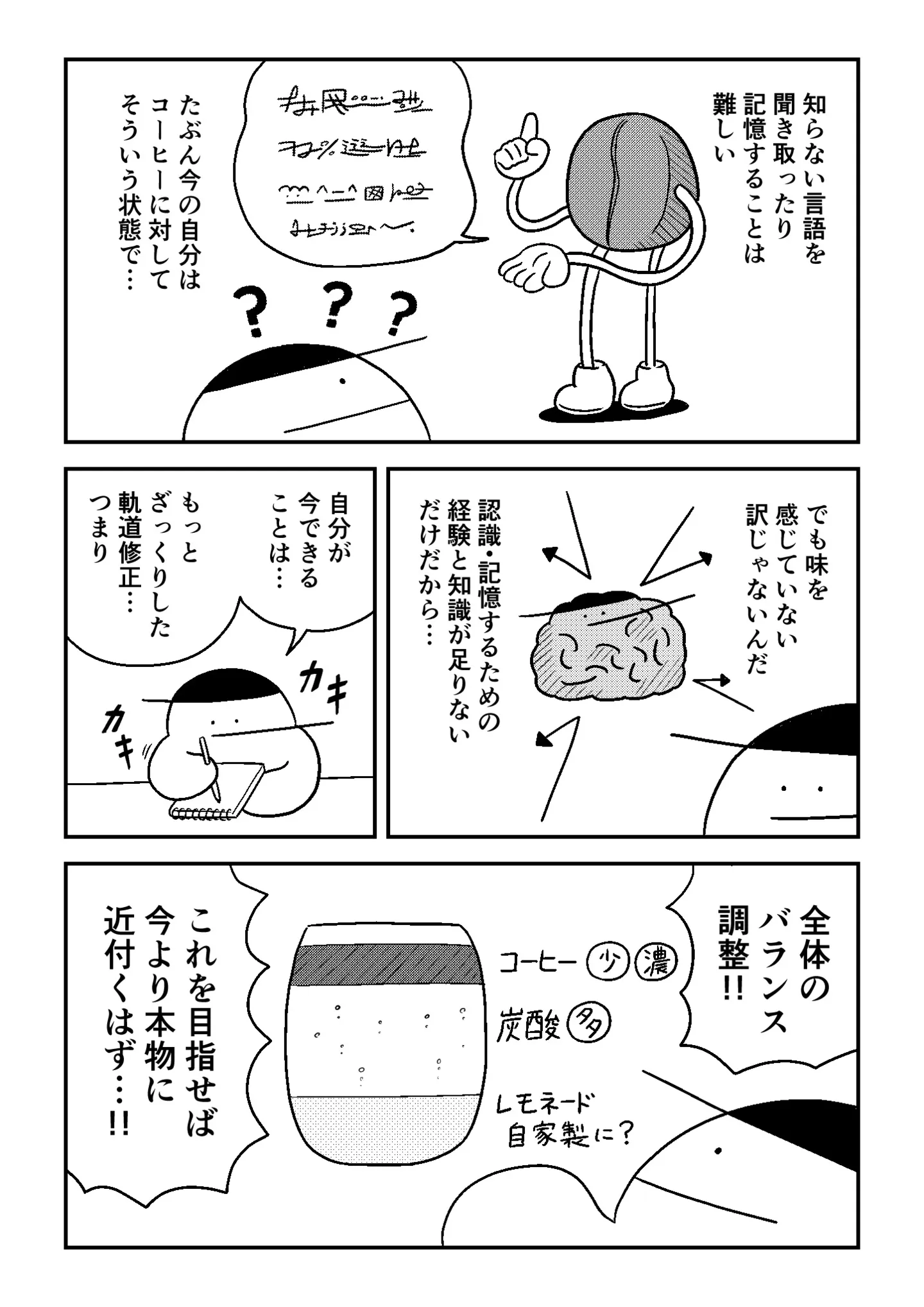 レモネード&コーヒーのドリンクにドハマり!自宅で再現して気づいた「プロってすごいな」/苦手なコーヒーをわかりたい⑩ マンガ 公開日:2025/12/19 この連載を最初から読む→ <第11回に続く> « 1 2 3 4 あわせて読みたい 【人気!】アイスコーヒーはブラックが正義? 思い込みを捨ててシロップを入れたら新たな世界が/苦手なコーヒーをわかりたい⑨ 【人気!】溜まりがちなドリップバッグコーヒー。おいしく淹れる方法を調べて気づいた、意外な事実/苦手なコーヒーをわかりたい⑤ 【漫画】「苦手なコーヒーをわかりたい」を第1回から読む 水出しアイスコーヒーの衝撃!ひとくちでわかる、すっきりとした味の違いに感動/苦手なコーヒーをわかりたい② 産地、焙煎、抽出…好奇心をくすぐる「コーヒーの世界」。ちょっとわくわくしてきたぞ!/苦手なコーヒーをわかりたい③ 最新マンガと話題の書籍を無料で試し読み! 前の回 一覧 人気の連載 次の回