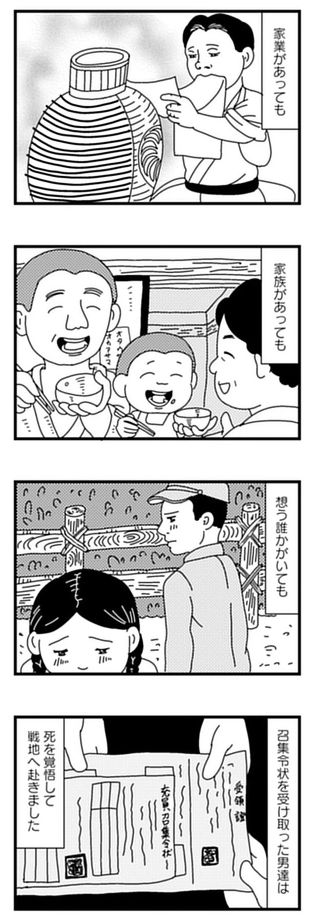 兵役は20~40歳全男子の義務だった。90代義父が語る戦時中の徴兵制度/お義父さん、戦争ってどげんやった?⑥ マンガ 公開日:2025/12/28 この連載を最初から読む→ <第7回に続く> 本作品をAmazon(電子)で読む > 本作品をRenta!で読む > 本作品をebookjapanで読む > 本作品をBOOK☆WALKERで読む > « 1 2 3 あわせて読みたい 【漫画】『お義父さん、戦争ってどげんやった?年の差婚した私が聞いた「あの日」の記憶』を第1回から読む 【漫画】『心曇る日は ご自愛ごはんを』を読む 【漫画】『グランプリは私ですけど何か?~自己肯定モンスターのミスコン無双~』を読む 最新マンガと話題の書籍を無料で試し読み! 前の回 一覧 人気の連載 次の回 お義父さん、戦争ってどげんやった?年の差婚した私が聞いた「あの日」の記憶 (バンブーコミックス エッセイセレクション) 試し読み *電子書籍ストアBOOK☆WALKERへ移動します