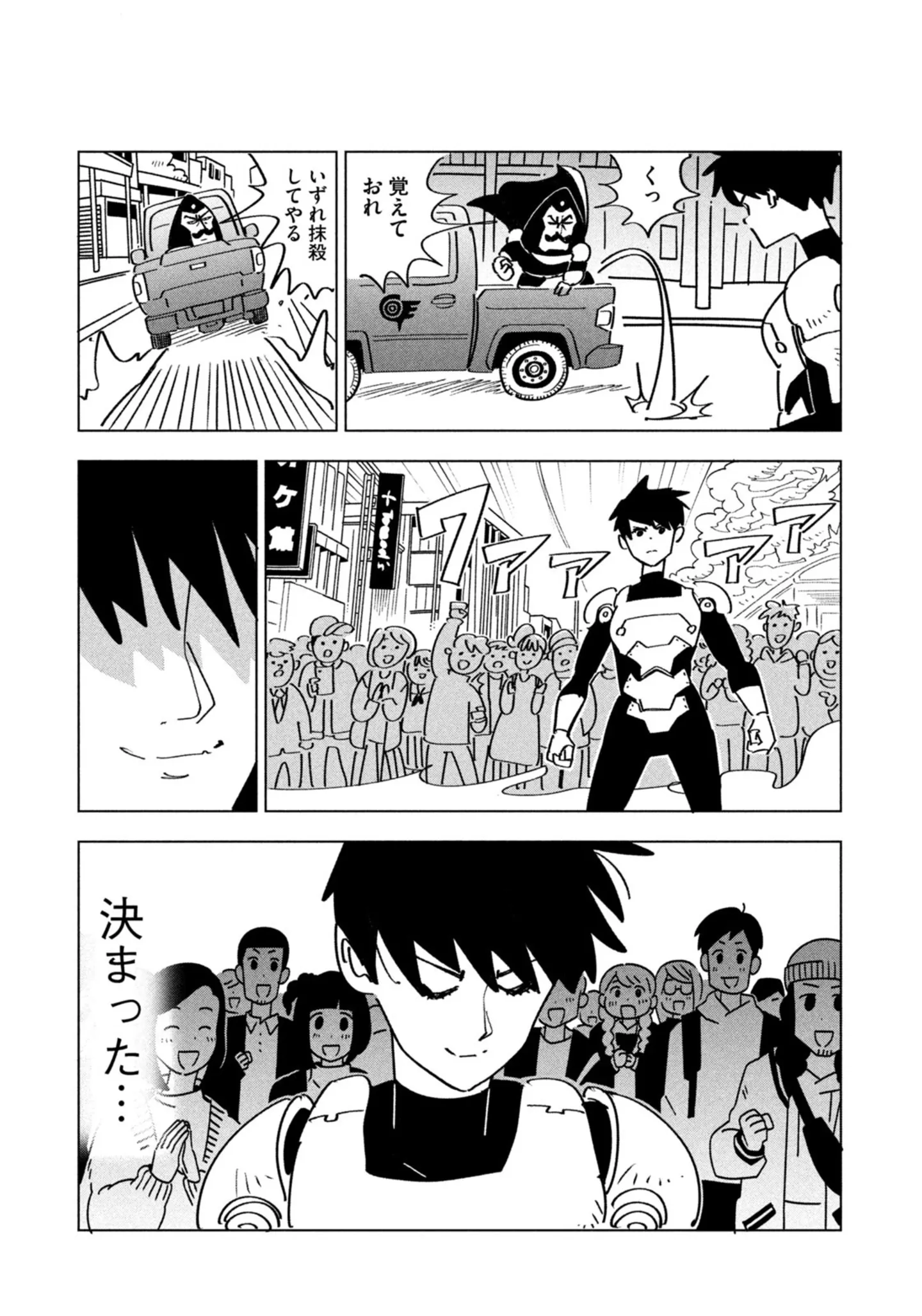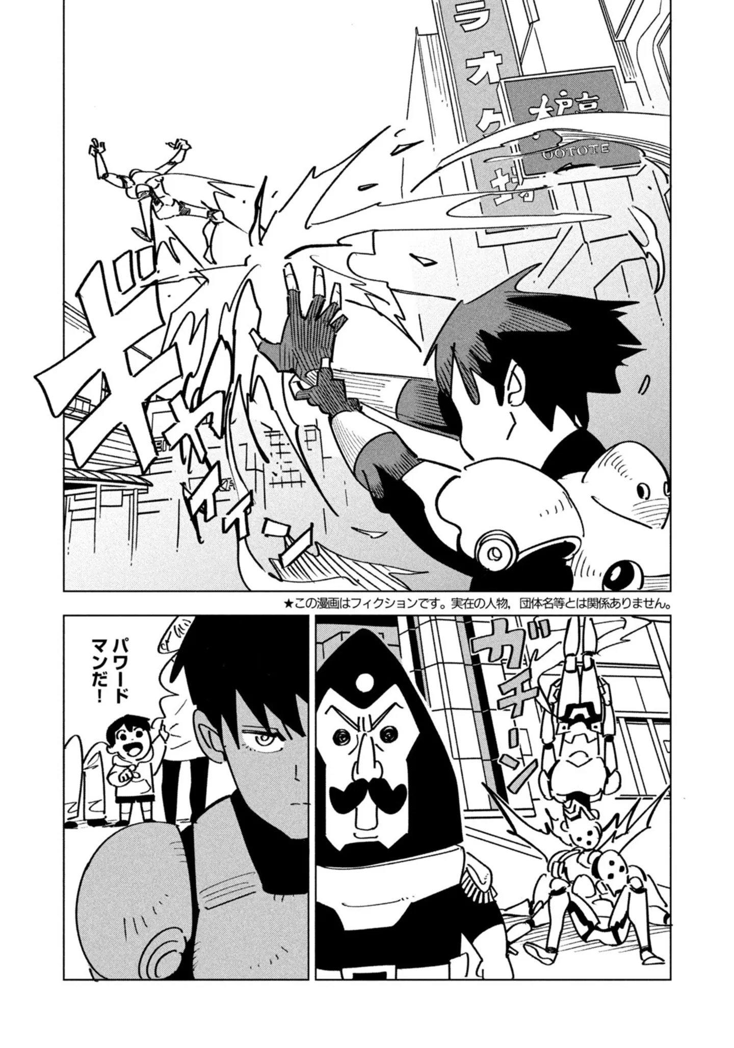 また、本作は秘密結社と戦うヒーローが主人公だ。ただミネタは戦う以外は不器用で、読んでいて笑顔になるし、謎めいた少女ニコンとの距離感の変化にほっこりもさせられる。ミネタの生真面目さと休み慣れないがゆえの戸惑いと、ニコンの天真爛漫さが絶妙なあたたかみを感じさせるのだ。