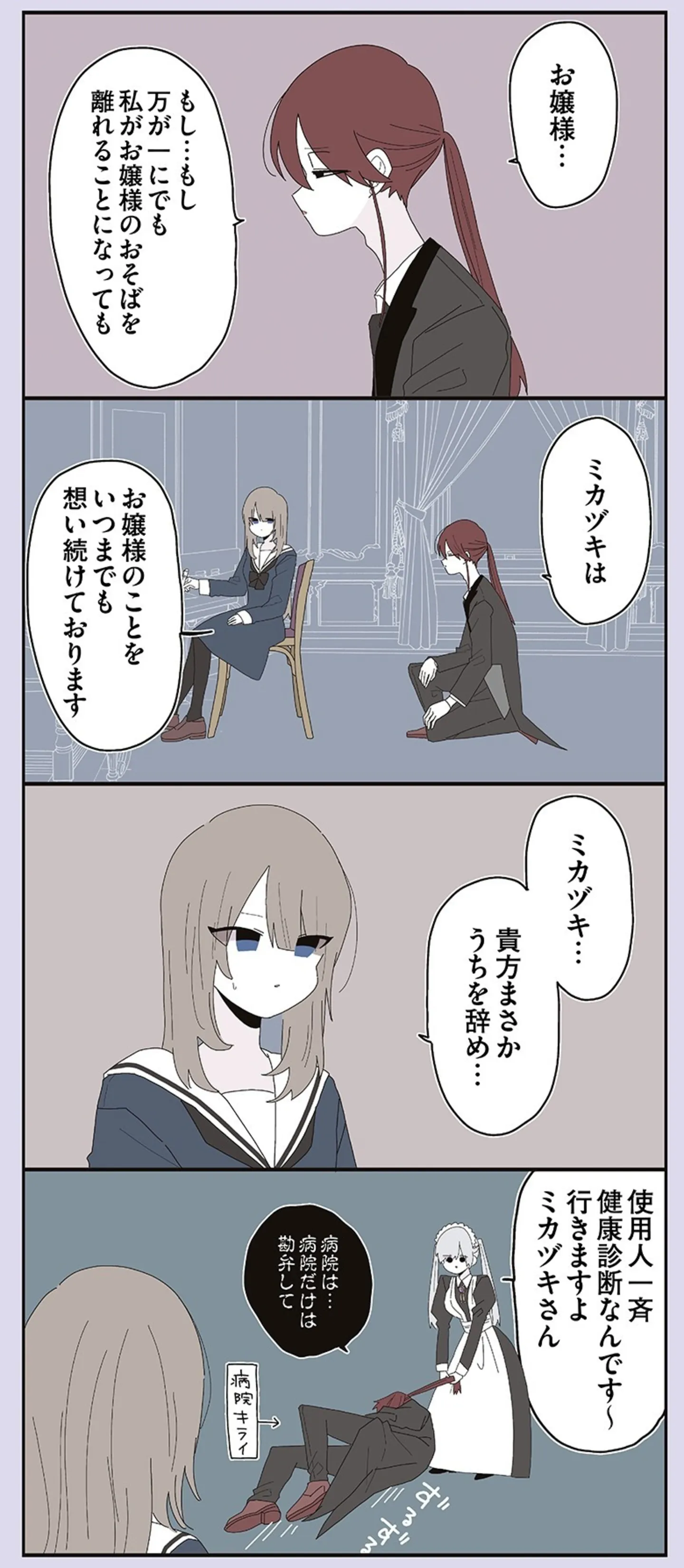 豪邸に暮らす物静かな女子高生のお嬢様と、そんな彼女を偏執的に愛する執事・ミカヅキ。お嬢様が踏んだ石、髪についたホコリ、食べ残したクリーム、浸かったあとの風呂の湯……お嬢様のすべてを愛し、すべてを知りたいミカヅキは、今日も過保護で変態的な愛をぶつけ続ける。しかし実は、ミカヅキとお嬢様は互いに打ち明けていない、ある秘密があって――。『ミカヅキのお嬢様備忘録』で、ちょっと不穏な純愛系コメディをお楽しみください。