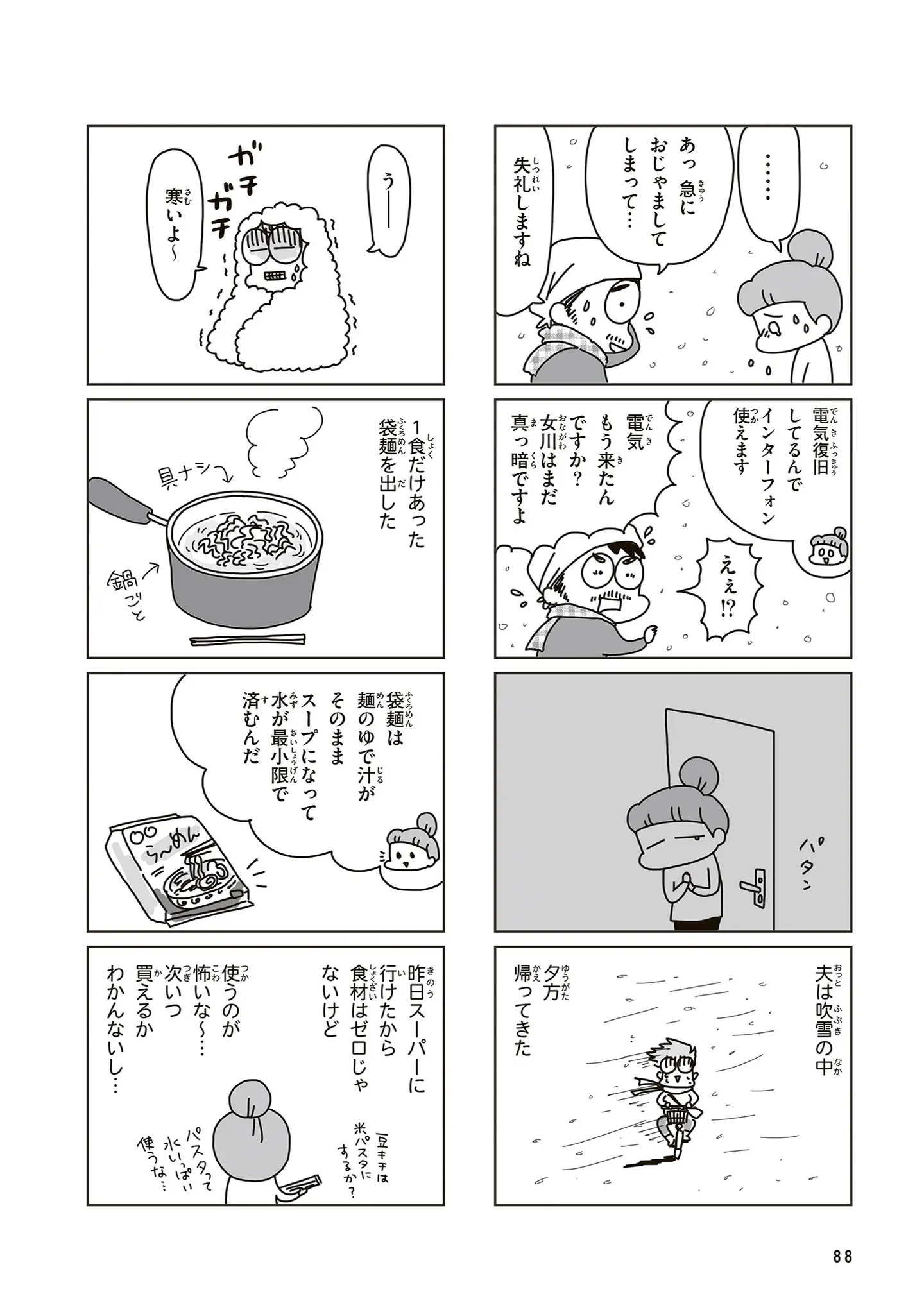 震災後、自宅も家族も無事だけど何かがツライ…。水は出ず、食生活も日常とは程遠い/今日、地震がおきたら⑧ マンガ 公開日:2026/1/22 この連載を最初から読む→ <第9回に続く> 本作品をAmazon(電子)で読む > 本作品をRenta!で読む > 本作品をebookjapanで読む > 本作品をBOOK☆WALKERで読む > « 1 2 3 あわせて読みたい 【漫画】『今日、地震がおきたら』を第1回から読む 【漫画】『いつかのやさしさに、今日も救われてます るしこの子育て日記3』を読む 【漫画】『勤労ロードショー 今日も財布がさみしくて』を読む 最新マンガと話題の書籍を無料で試し読み! 前の回 一覧 人気の連載 次の回 今日、地震がおきたら (コミックエッセイ) 試し読み *電子書籍ストアBOOK☆WALKERへ移動します