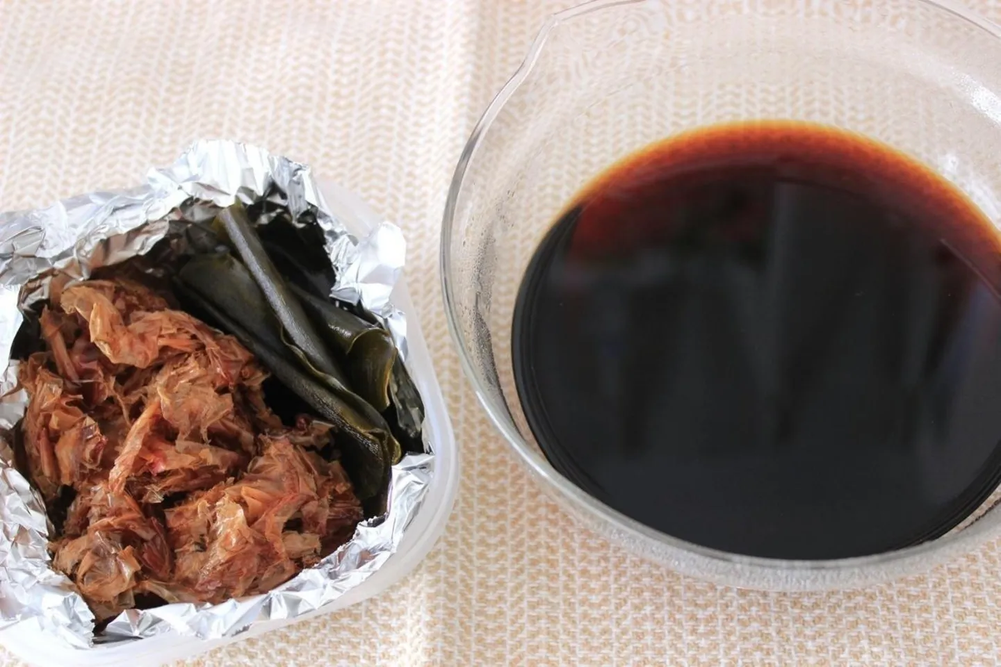 まずは、すべての基本となる「無限つゆ」作りから。材料は、醤油、みりん、酒、昆布、鰹節の5つのみ。これはまとめて作るので、作るのはひと月に1~2回でOK。まずは醤油に昆布を漬け込み、昆布のうまみを醤油に移しておく。