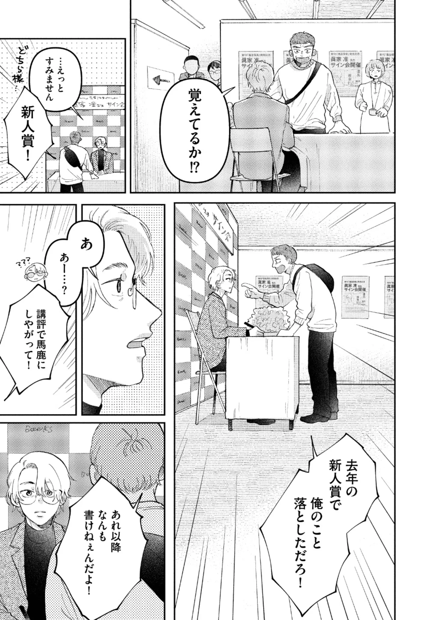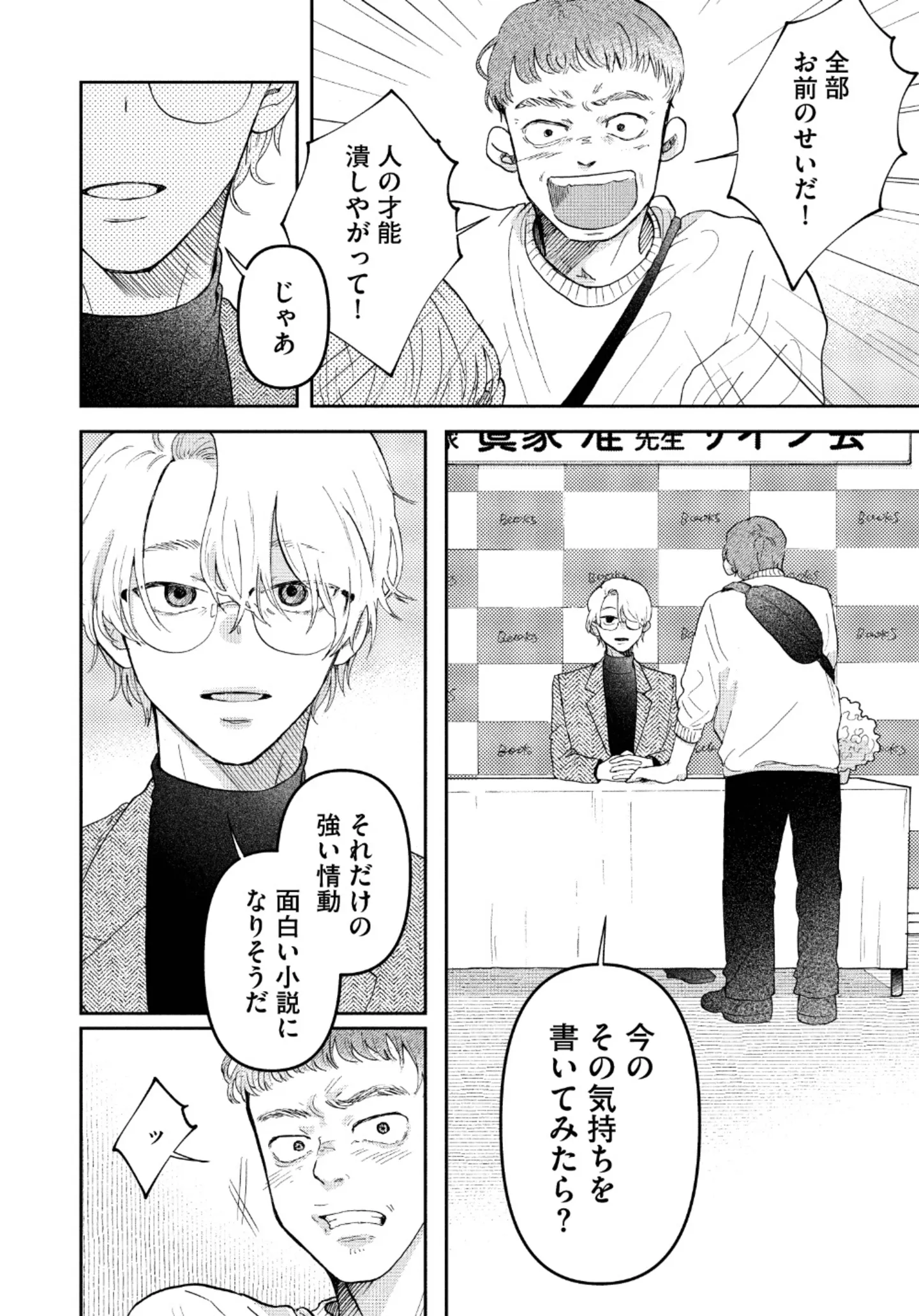 気乗りしないサイン会。粛々とこなす小説家の前に、落選した小説家志望が現れ――/正しいナイフの使い方② マンガ 公開日:2026/1/10 この連載を最初から読む→ <第3回に続く> 本作品をAmazon(電子)で読む > 本作品をDMMブックスで読む > 本作品をBOOK☆WALKERで読む > « 1 2 3 あわせて読みたい 【漫画】『正しいナイフの使い方』を第1回から読む 【漫画】『星屑家族』を読む 【漫画】『痔だと思ったら大腸がんステージ4でした 標準治療を旅と漫画で乗り越えてなんとか経過観察になるまで』を読む 【漫画】『愛され女子でスミマセン』を読む 最新マンガと話題の書籍を無料で試し読み! 前の回 一覧 人気の連載 次の回 正しいナイフの使い方 1 (ビームコミックス) 試し読み *電子書籍ストアBOOK☆WALKERへ移動します