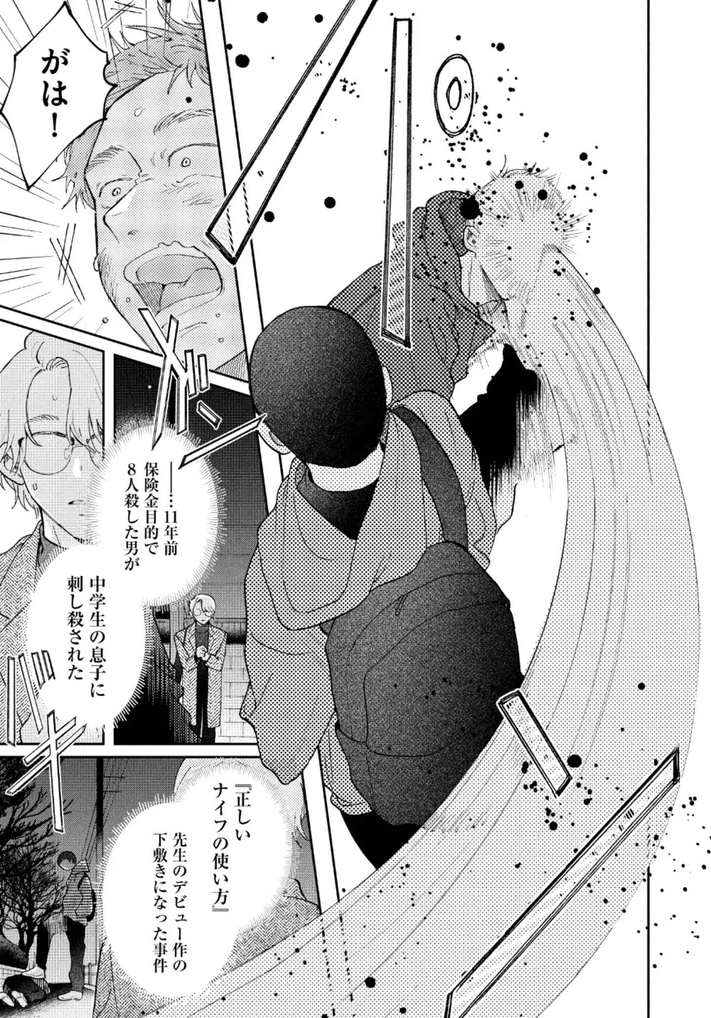 暴漢から間一髪で救われた小説家。逆上して切りかかる暴漢に、男が笑顔でやり返す/正しいナイフの使い方⑦ マンガ 公開日:2026/1/15 この連載を最初から読む→ <第8回に続く> 本作品をAmazon(電子)で読む > 本作品をDMMブックスで読む > 本作品をBOOK☆WALKERで読む > « 1 2 3 あわせて読みたい 【漫画】『正しいナイフの使い方』を第1回から読む 【漫画】『娘をグルーミングする先生』を読む 【漫画】『策略女を許さない 職場のヤバイ女が自滅するまで』を読む 【漫画】『星屑家族』を読む 最新マンガと話題の書籍を無料で試し読み! 前の回 一覧 人気の連載 次の回 正しいナイフの使い方 1 (ビームコミックス) 試し読み *電子書籍ストアBOOK☆WALKERへ移動します