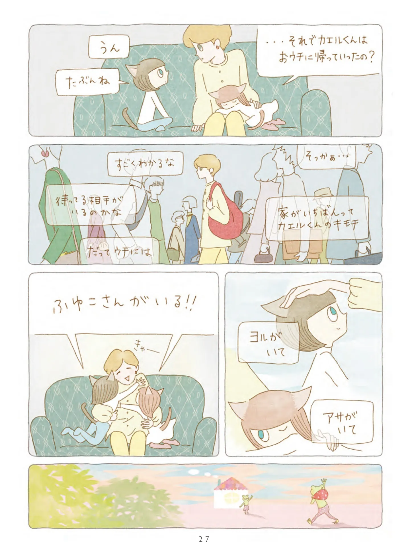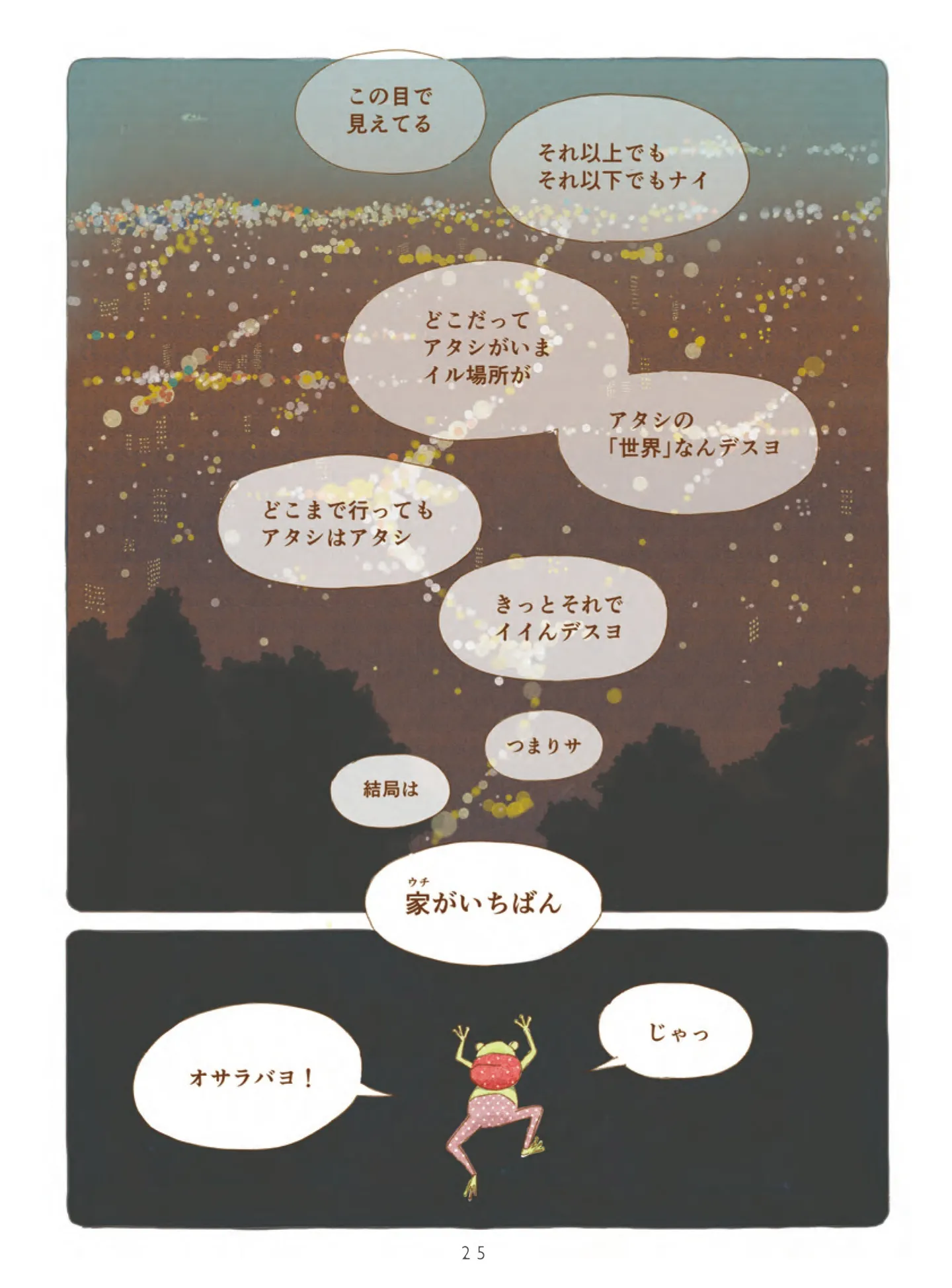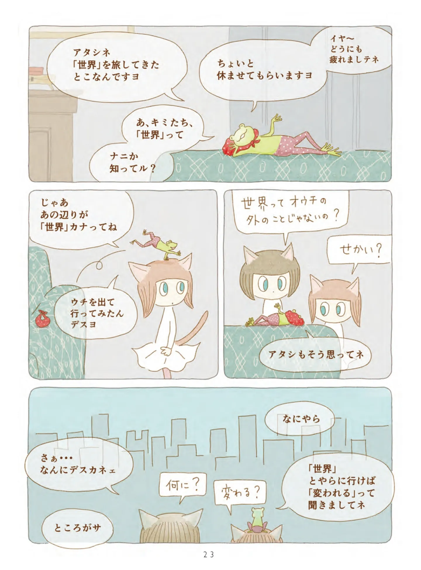 「世界」を旅してきたというカエルが教えてくれたこと【旅するカエル】/夜が明けるとき猫がそばにいれば マンガ 公開日:2026/1/18 この連載を最初から読む→ <第4回に続く> 本作品をAmazon(電子)で読む > 本作品をRenta!で読む > 本作品をBOOK☆WALKERで読む > « 1 2 あわせて読みたい 【漫画】『夜が明けるとき猫がそばにいれば』を第1回から読む 2匹の猫と過ごす、ちょっと不思議で愛おしい日々。季節の移ろいを感じる、癒やしの猫ファンタジー 【漫画】『推しがとなりで寝てまして』を第1回から読む 【漫画】『茶トラのやっちゃん』を読む 【漫画】『しまねこ3姉妹と暮らしています』を読む 最新マンガと話題の書籍を無料で試し読み! 前の回 一覧 人気の連載 次の回 夜が明けるとき猫がそばにいれば (OZcomics) 試し読み *電子書籍ストアBOOK☆WALKERへ移動します