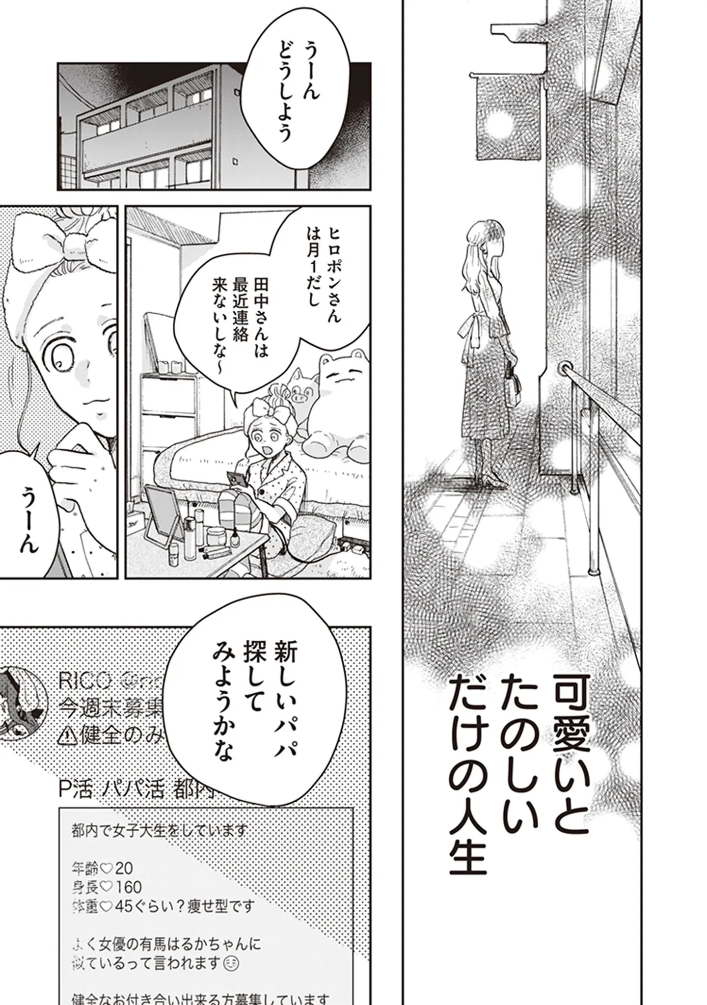 お金をくれないパパとはバイバイ。新たな相手を探すパパ活女子の目に留まったのは…/マーブルビターチョコレート① マンガ 公開日:2026/1/17 <第2回に続く> 本作品をAmazon(電子)で読む > 本作品をRenta!で読む > 本作品をebookjapanで読む > 本作品をBOOK☆WALKERで読む > « 1 2 3 あわせて読みたい 【漫画】『マーブルビターチョコレート』を読む 【漫画】『正しいナイフの使い方』を読む 【漫画】『星屑家族』を読む 【漫画】『気になってる人が男じゃなかった』を読む 【漫画】『放置子の面倒を見るのは誰ですか?』を読む 最新マンガと話題の書籍を無料で試し読み! 前の回 一覧 人気の連載 次の回 マーブルビターチョコレート (ビームコミックス) 試し読み *電子書籍ストアBOOK☆WALKERへ移動します