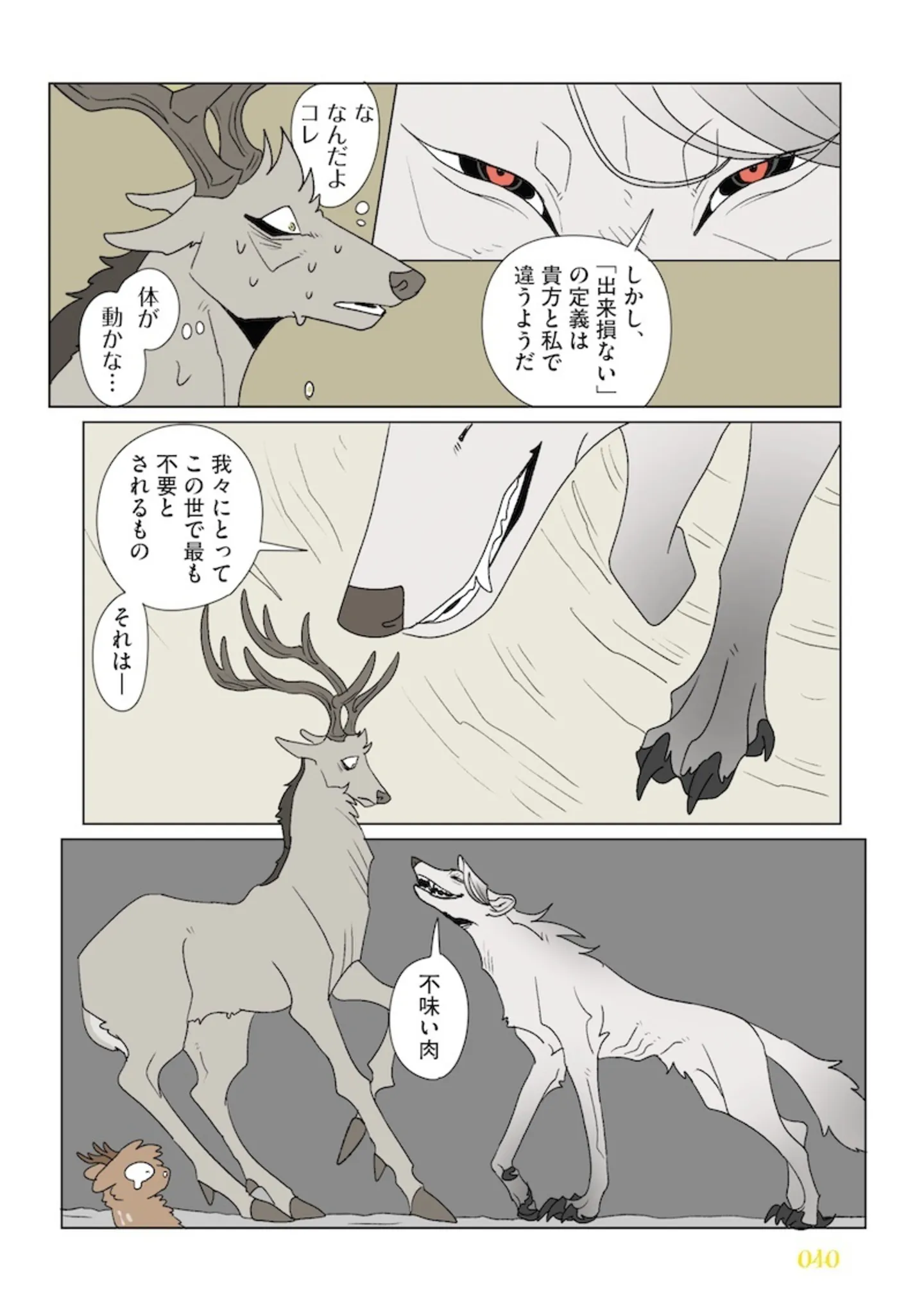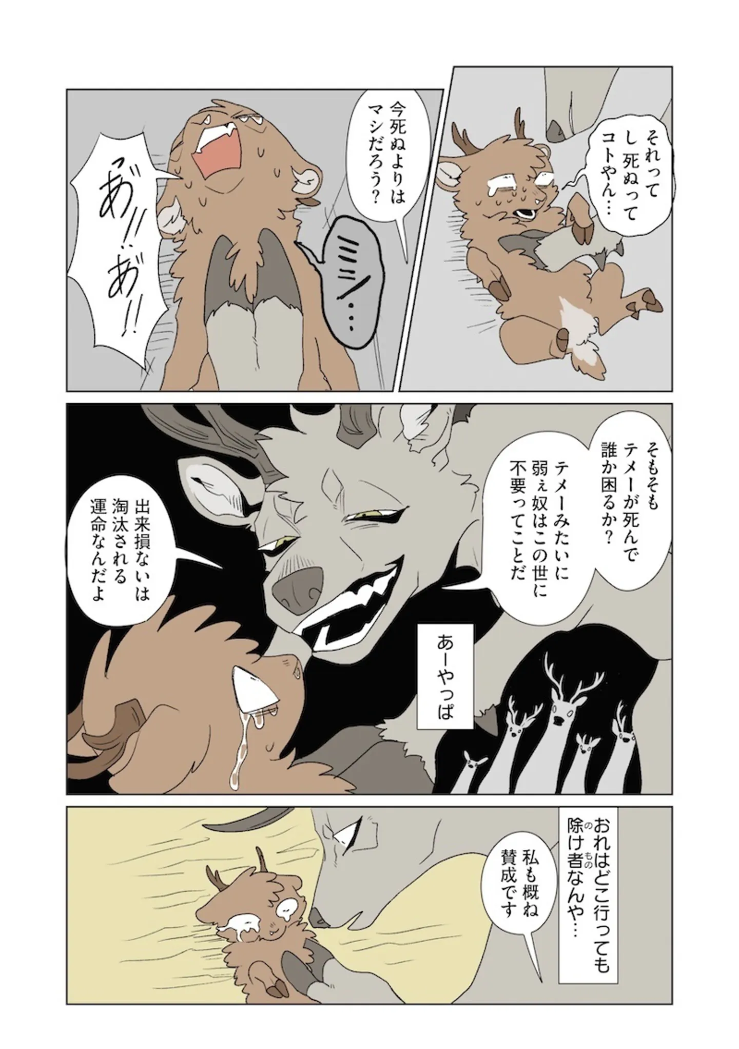 同じ群れの仲間のはずが…蹴ったうえにあざけるように笑い出したシカたちの言い分/ふたりのけもの④ マンガ 公開日:2026/1/4 この連載を最初から読む→ <第5回に続く> 本作品をAmazon(電子)で読む > 本作品をRenta!で読む > 本作品をebookjapanで読む > 本作品をBOOK☆WALKERで読む > « 1 2 3 あわせて読みたい 【漫画】『ふたりのけもの』を第1回から読む 【漫画】『モラハラ男、マウント女 完全懲罰ファイル』を読む 【漫画】『娘を妊娠させたのは誰ですか?』を読む 最新マンガと話題の書籍を無料で試し読み! 前の回 一覧 人気の連載 次の回 ふたりのけもの (コミックエッセイ) 試し読み *電子書籍ストアBOOK☆WALKERへ移動します