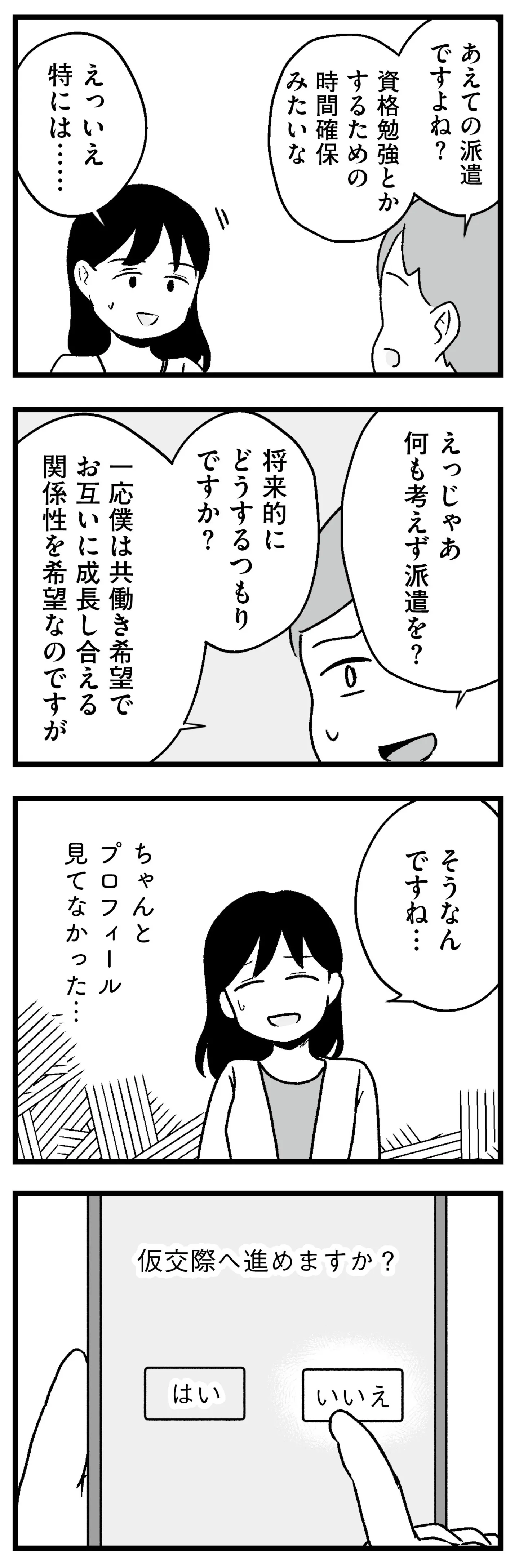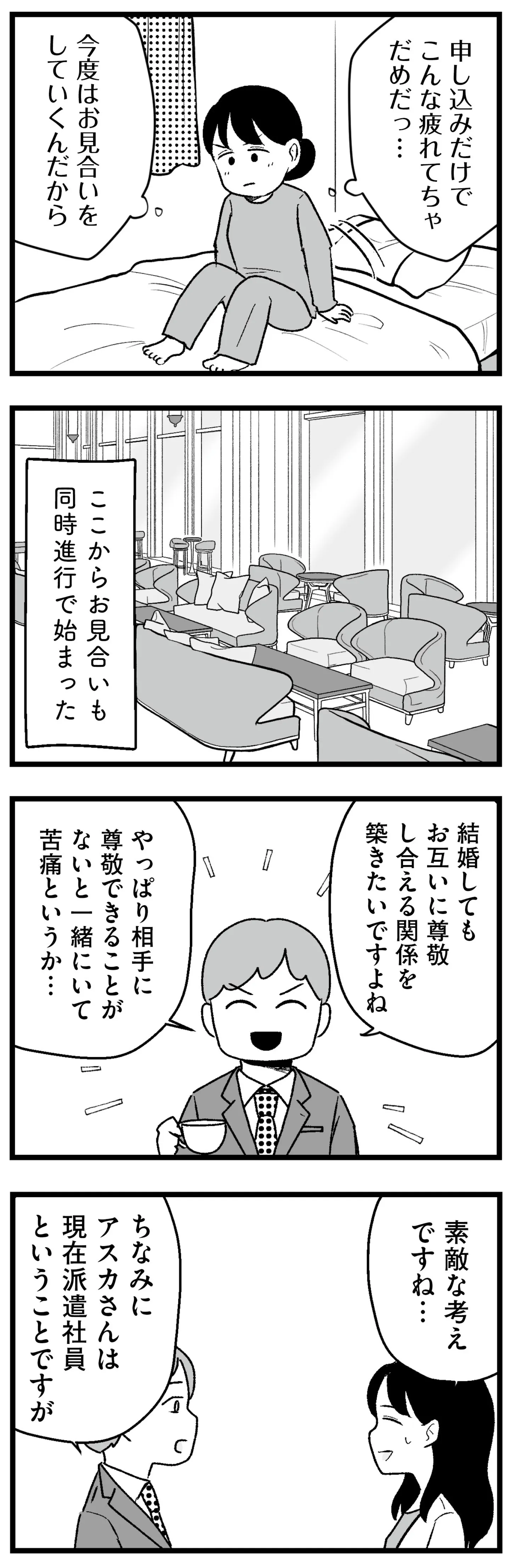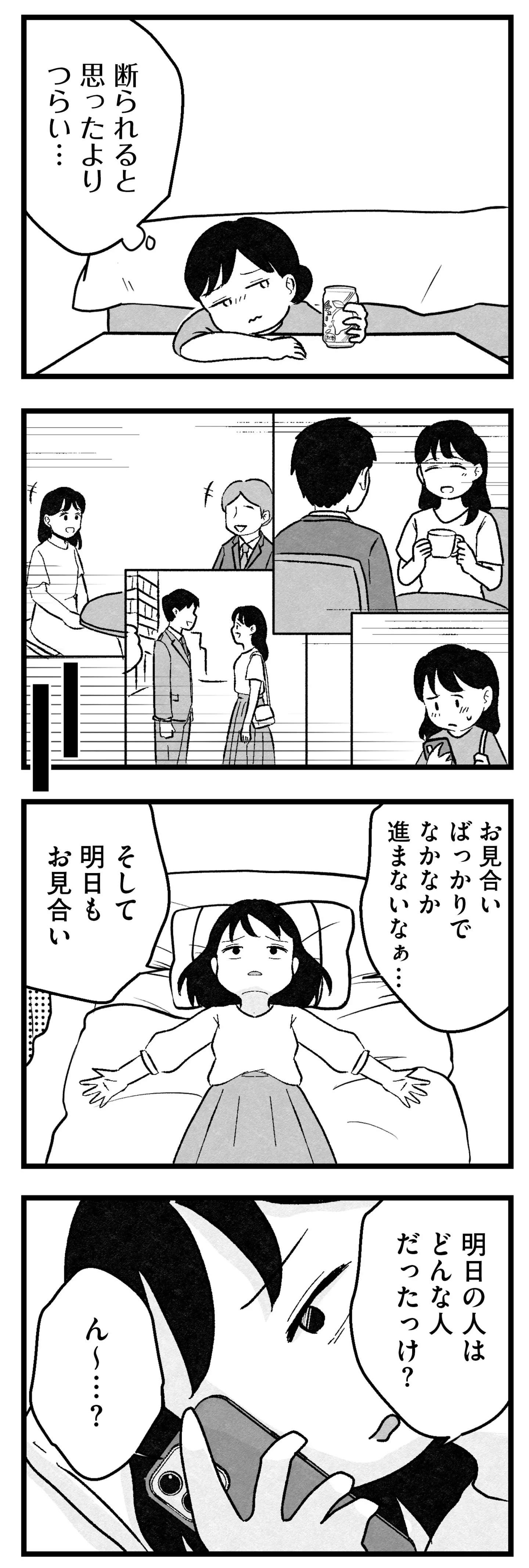 最低30人にお見合いを申し込む!? 結婚相談所ってこんなに大変なの?/結婚さえできないわたし⑨ マンガ 公開日:2026/1/28 この連載を最初から読む→ <第10回に続く> 本作品をAmazon(電子)で読む > 本作品をRenta!で読む > 本作品をebookjapanで読む > 本作品をBOOK☆WALKERで読む > « 1 2 3 あわせて読みたい 【漫画】『結婚さえできないわたし 29歳からの婚活地獄』を第1回から読む 【漫画】『ママ5年目でがんなんて 手に入れた卵子と失った味覚』を読む 【漫画】『今日もワタシが一番カワイイ 残念マウント女子MAYU』を読む 最新マンガと話題の書籍を無料で試し読み! 前の回 一覧 人気の連載 次の回 結婚さえできないわたし 29歳からの婚活地獄 (コミックエッセイ) 試し読み *電子書籍ストアBOOK☆WALKERへ移動します