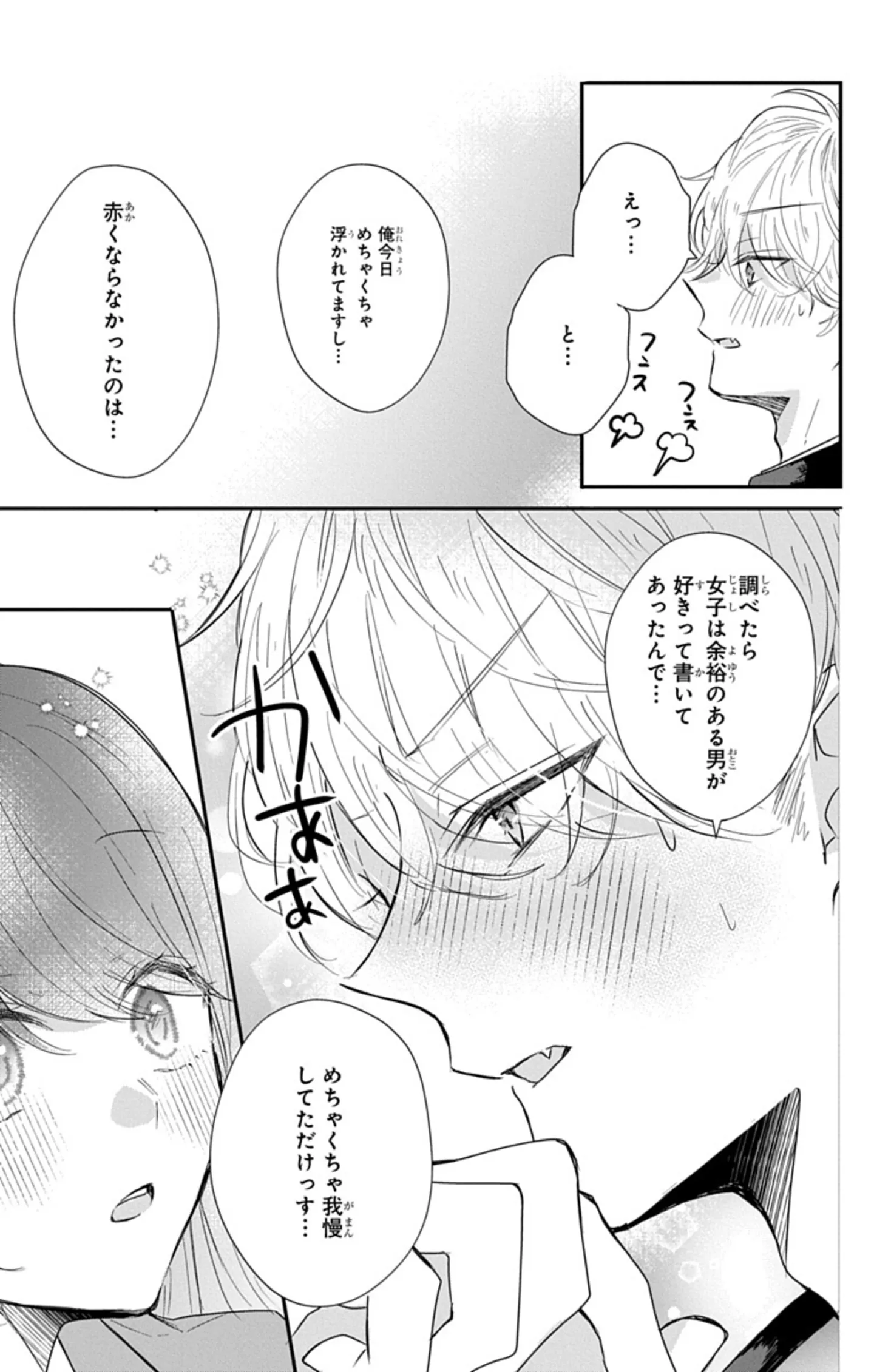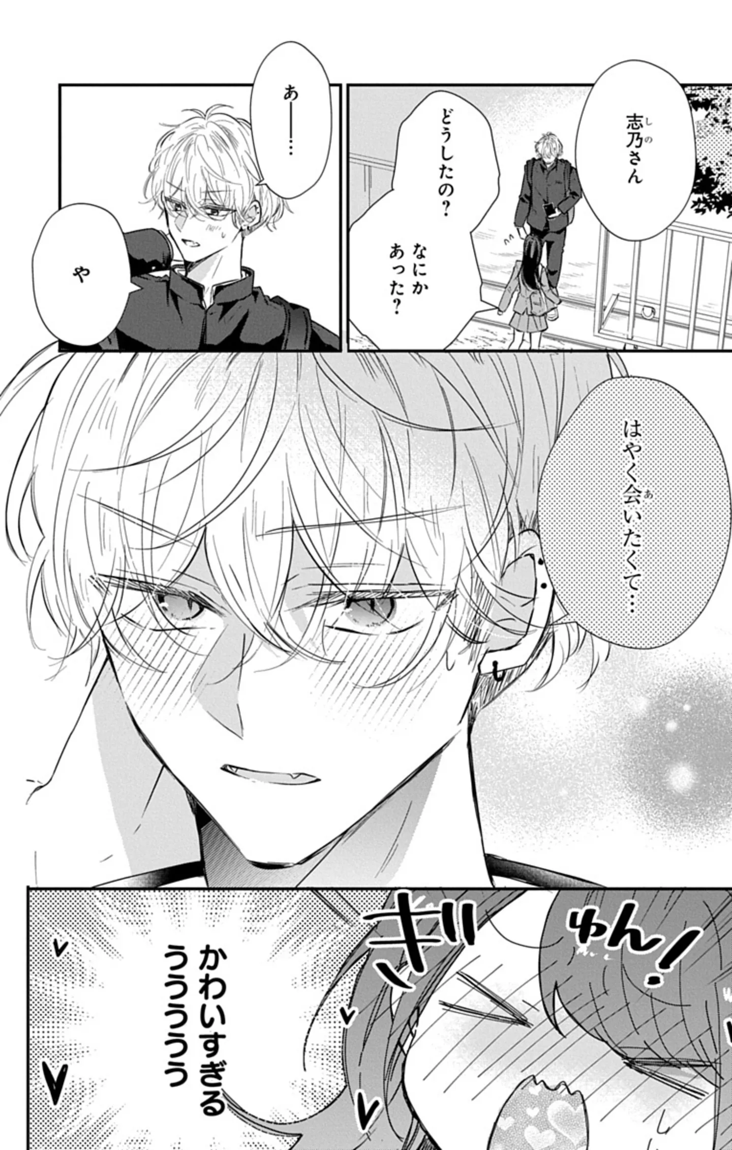 話してみると、虎は予想外に素直な少年で、喫茶店のクリームソーダが大好きだという。少し照れながら話す彼に、「意外と可愛いかも」と感じ始める志乃。手が当たっただけで赤面する彼を見て、「不良なのにウブなの…?」とそのギャップにキュンキュンが止まらない志乃。褒められて嬉しそうにしている虎を見て、その可愛さに心の中で絶叫する志乃……もう、完全に恋に落ちている。
