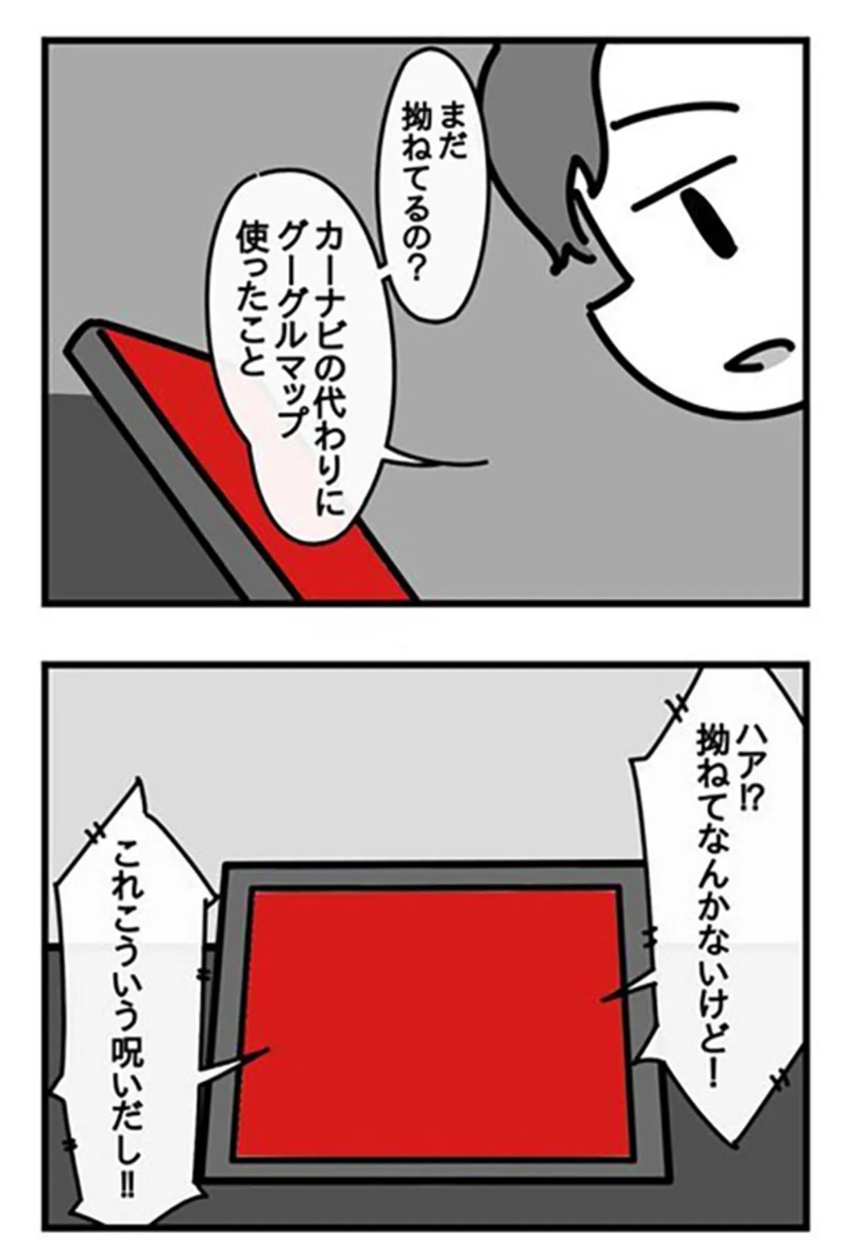 前の話の続きの4コマ漫画でした。実はナビが「この先、直進です」と言いながら、運転手を崖から落とそうとしたのにはある理由があったようです。その理由とは、運転手がカーナビの代わりにグーグルマップを使おうとしたこと。ナビは拗ねていたようです。可愛いですね。可愛いさのあまり、崖から突き落とそうとしていたことを忘れてしまいそうになりました。ツンデレ気味のナビとのやりとり、運転手の包容力に真っ赤だったカーナビの画面の色が変わるところにも注目です///