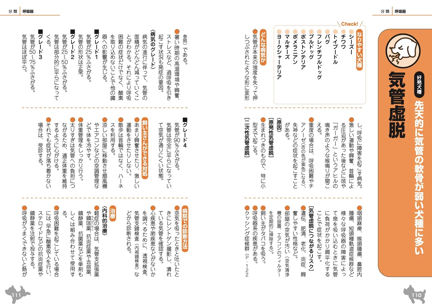 犬種別の疾患も紹介されている。たとえば、気管が変形して呼吸しづらくなる「気管虚脱」は、パグやトイプードルなど先天的に気管の軟骨が弱い犬種に多い疾患だという。興奮しやすい性格の愛犬や、空気が汚れた部屋で暮らす愛犬は特に要注意。「咳が出る」「呼吸がおかしい」ときは、見た目で判断できない病気が多いため、病院での検査が正確な診断の手がかりとなるという。一方的な判断をせず、早めに受診するのが良いだろう。