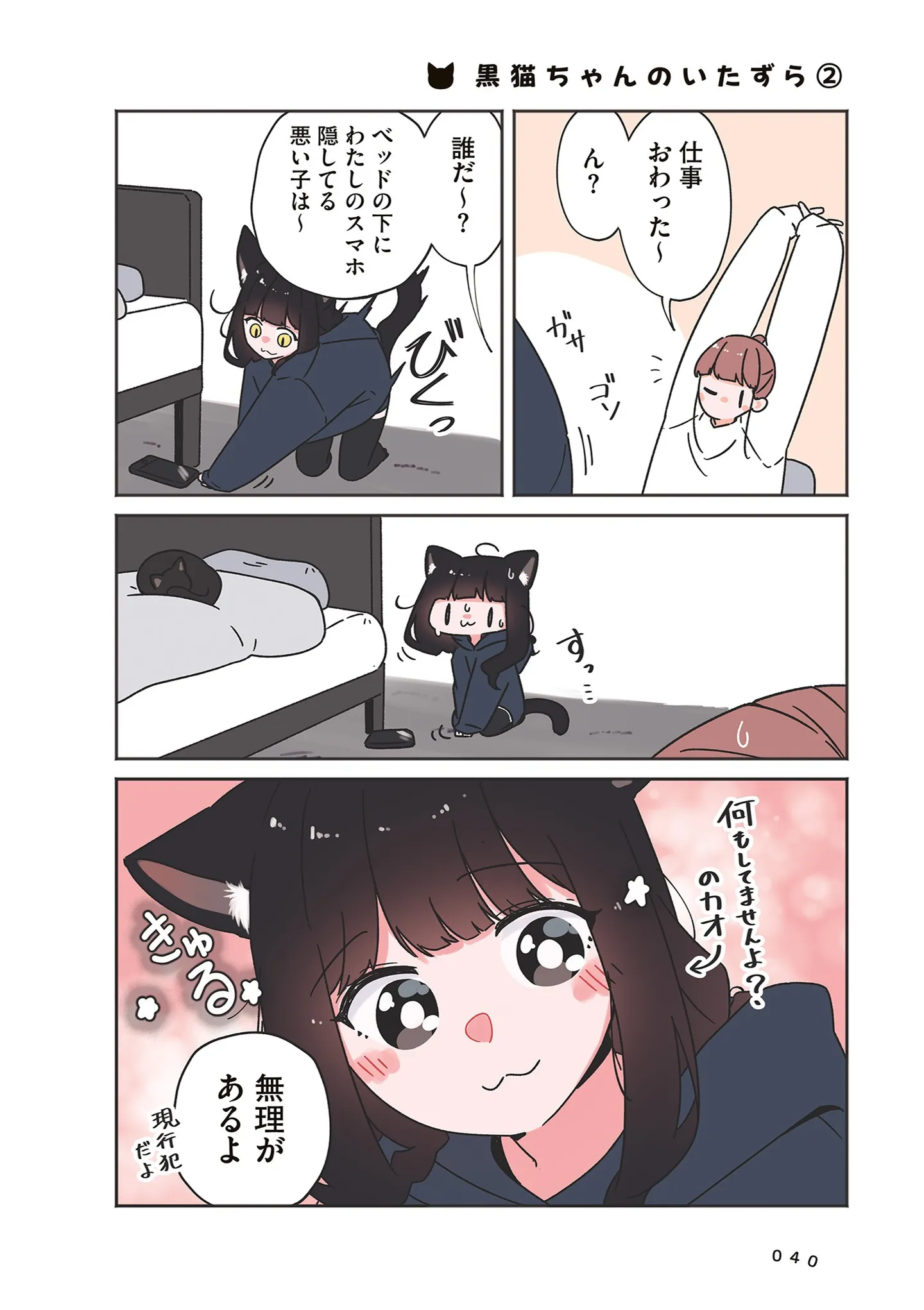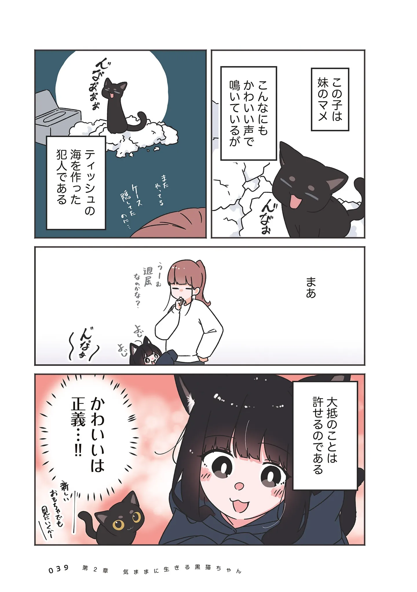 棚をひっくり返したりティッシュの海を作ったり…イタズラされても許してしまう理由/うちの黒猫、おんなのこ⑤ マンガ 公開日:2026/1/31 この連載を最初から読む→ <第6回に続く> 本作品をAmazon(電子)で読む > 本作品をRenta!で読む > 本作品をebookjapanで読む > 本作品をBOOK☆WALKERで読む > « 1 2 あわせて読みたい 【漫画】『うちの黒猫、おんなのこ きまぐれ姉妹のクロとマメ』を第1回から読む 【漫画】『ちっちゃくてかわいいワタシ 痛すぎる勘違い女の正体』を読む 【漫画】『彼とねこが待っている。』を読む 最新マンガと話題の書籍を無料で試し読み! 前の回 一覧 人気の連載 次の回 うちの黒猫、おんなのこ きまぐれ姉妹のクロとマメ (コミックエッセイ) 試し読み *電子書籍ストアBOOK☆WALKERへ移動します