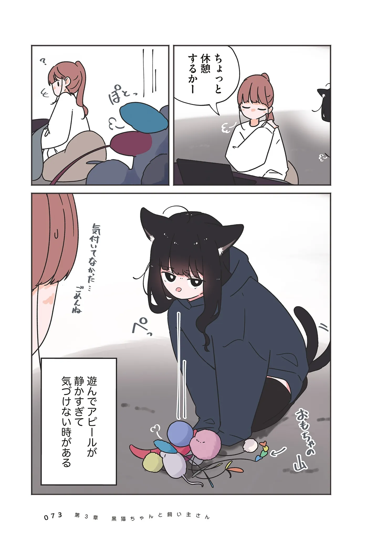 「こね」職人たちの朝は早い。朝起きると、よく使うクッションを猫がこねていて?/うちの黒猫、おんなのこ⑨ マンガ 公開日:2026/2/4 この連載を最初から読む→ <第10回に続く> 本作品をAmazon(電子)で読む > 本作品をRenta!で読む > 本作品をebookjapanで読む > 本作品をBOOK☆WALKERで読む > « 1 2 3 あわせて読みたい 【漫画】『うちの黒猫、おんなのこ きまぐれ姉妹のクロとマメ』を第1回から読む 【漫画】『ママ5年目でがんなんて 手に入れた卵子と失った味覚』を読む 【漫画】『世界の終わりに柴犬と』を読む 最新マンガと話題の書籍を無料で試し読み! 前の回 一覧 人気の連載 次の回 うちの黒猫、おんなのこ きまぐれ姉妹のクロとマメ (コミックエッセイ) 試し読み *電子書籍ストアBOOK☆WALKERへ移動します