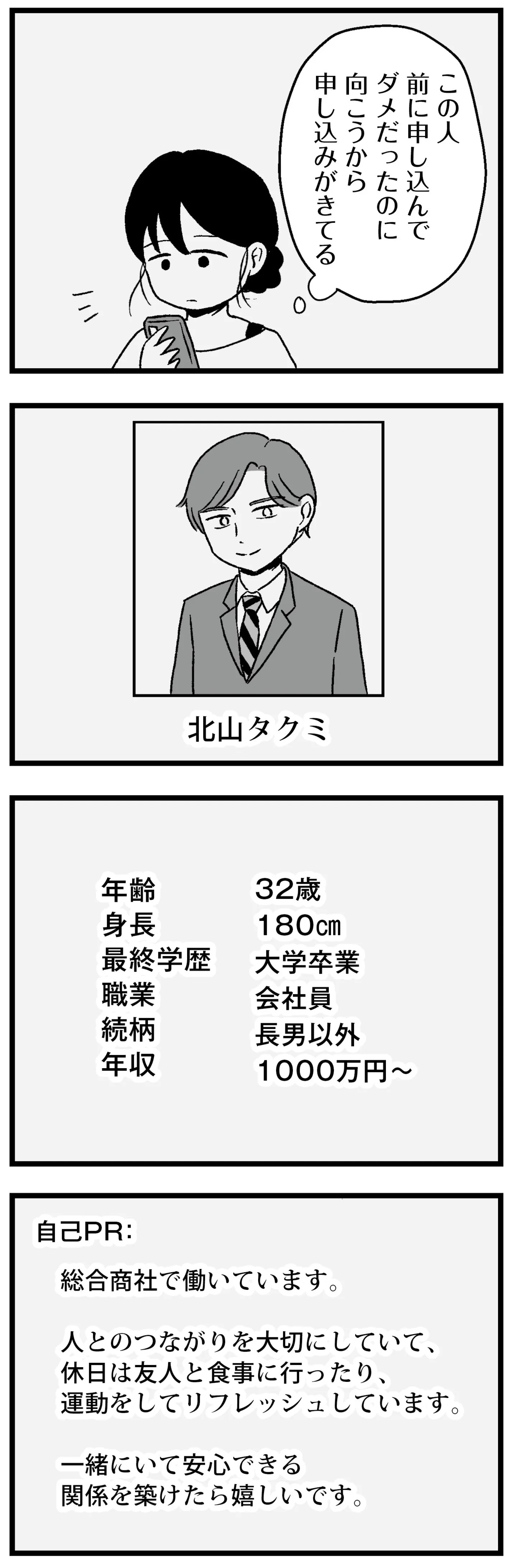 結婚相談所でハイスペック男性から仮交際の申込。きっと「運命の人」に違いない/結婚さえできないわたし⑫ マンガ 公開日:2026/1/31 この連載を最初から読む→ 本作品をAmazon(電子)で読む > 本作品をRenta!で読む > >> 次のページに続く « 1 2 3 > あわせて読みたい 【漫画】『結婚さえできないわたし 29歳からの婚活地獄』を第1回から読む 【漫画】『痔だと思ったら大腸がんステージ4でした 標準治療を旅と漫画で乗り越えてなんとか経過観察になるまで』を読む 【漫画】『愛され女子でスミマセン』を読む 最新マンガと話題の書籍を無料で試し読み! 前の回 一覧 人気の連載 次の回 結婚さえできないわたし 29歳からの婚活地獄 (コミックエッセイ) 試し読み *電子書籍ストアBOOK☆WALKERへ移動します