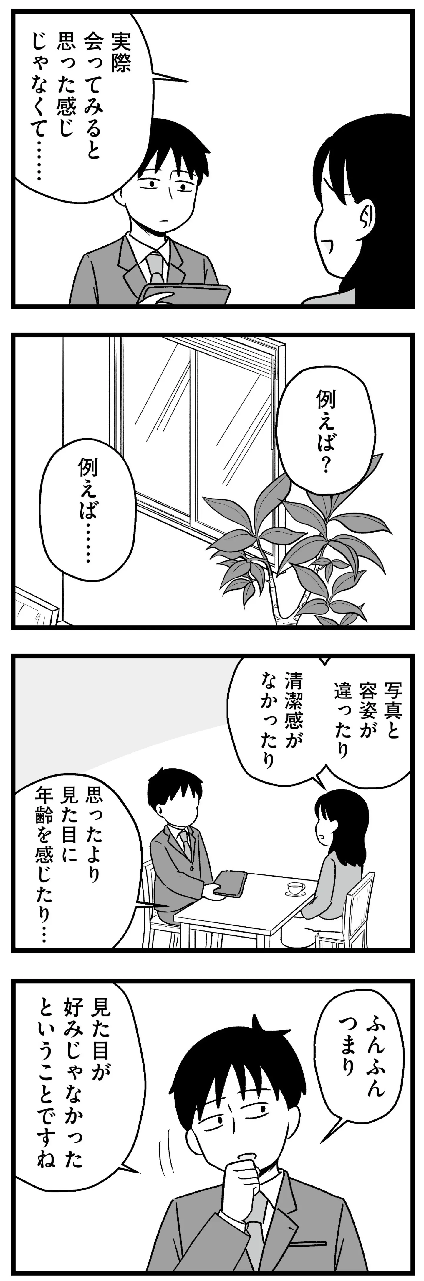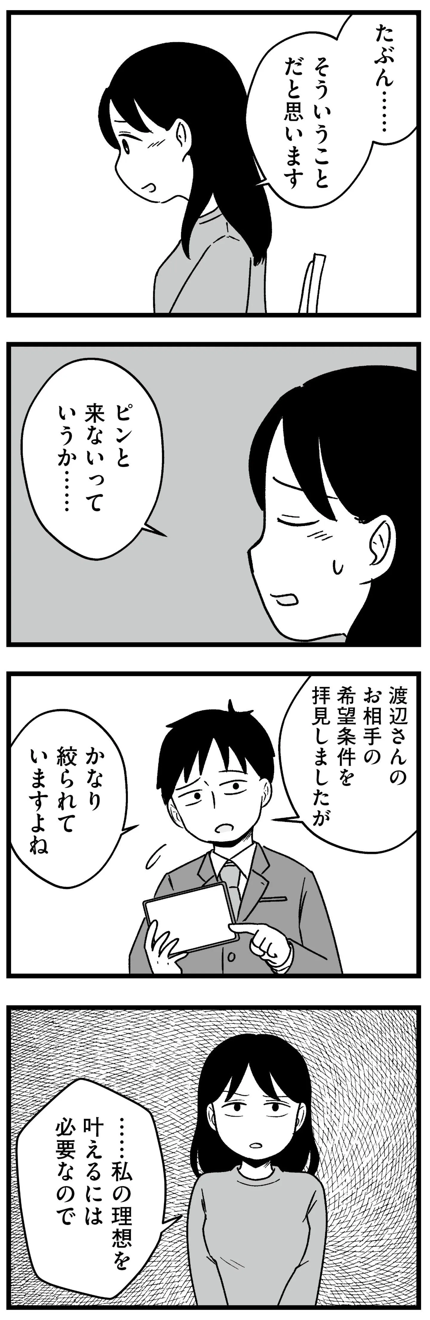 結婚相手を高望みの条件で絞るアラサー女子。婚活アドバイザーが現実を突きつける/結婚さえできないわたし⑱ マンガ 公開日:2026/2/6 この連載を最初から読む→ 本作品をAmazon(電子)で読む > 本作品をRenta!で読む > >> 次のページに続く « 1 2 3 > あわせて読みたい 【漫画】『結婚さえできないわたし 29歳からの婚活地獄』を第1回から読む 【漫画】『勤労ロードショー 今日も財布がさみしくて』を読む 【漫画】『心曇る日は ご自愛ごはんを』を読む 最新マンガと話題の書籍を無料で試し読み! 前の回 一覧 人気の連載 次の回 結婚さえできないわたし 29歳からの婚活地獄 (コミックエッセイ) 試し読み *電子書籍ストアBOOK☆WALKERへ移動します