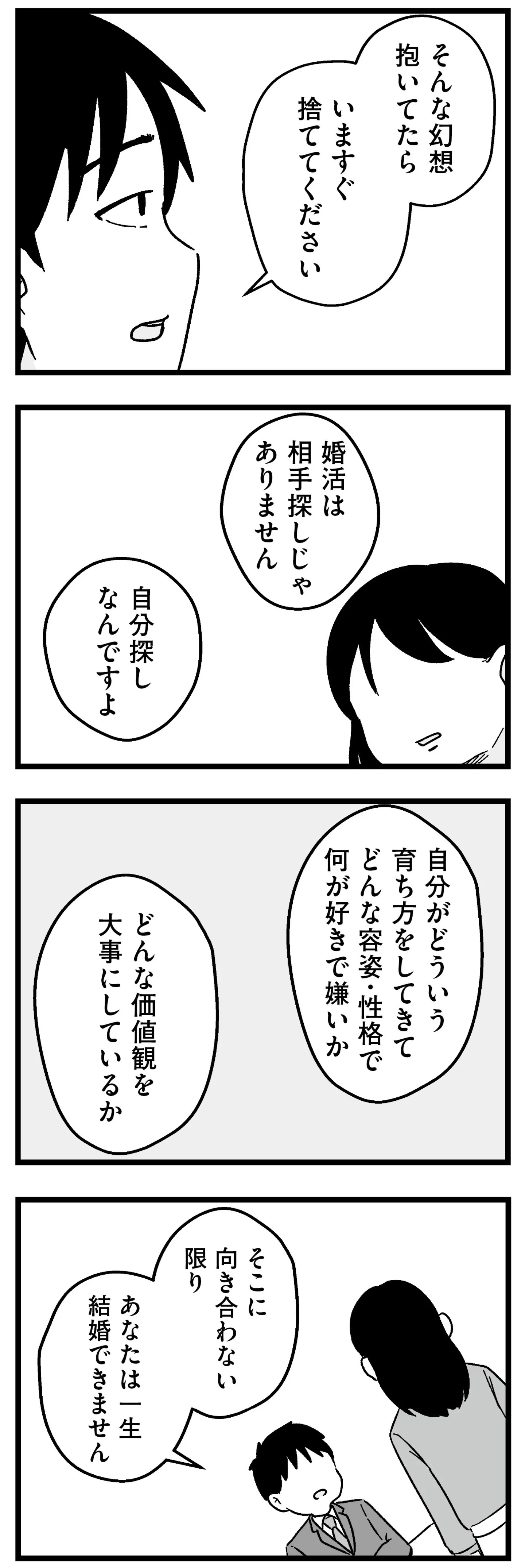 ハイスペック男性との交際を経て自分の価値を勘違い。婚活アドバイザーの厳しい指摘に…/結婚さえできないわたし⑲ マンガ 公開日:2026/2/7 この連載を最初から読む→ <第20回に続く> 本作品をAmazon(電子)で読む > 本作品をRenta!で読む > 本作品をebookjapanで読む > 本作品をBOOK☆WALKERで読む > « 1 2 3 4 あわせて読みたい 【漫画】『結婚さえできないわたし 29歳からの婚活地獄』を第1回から読む 【漫画】『ママ5年目でがんなんて 手に入れた卵子と失った味覚』を読む 【漫画】『今日もワタシが一番カワイイ 残念マウント女子MAYU』を読む 最新マンガと話題の書籍を無料で試し読み! 前の回 一覧 人気の連載 次の回 結婚さえできないわたし 29歳からの婚活地獄 (コミックエッセイ) 試し読み *電子書籍ストアBOOK☆WALKERへ移動します