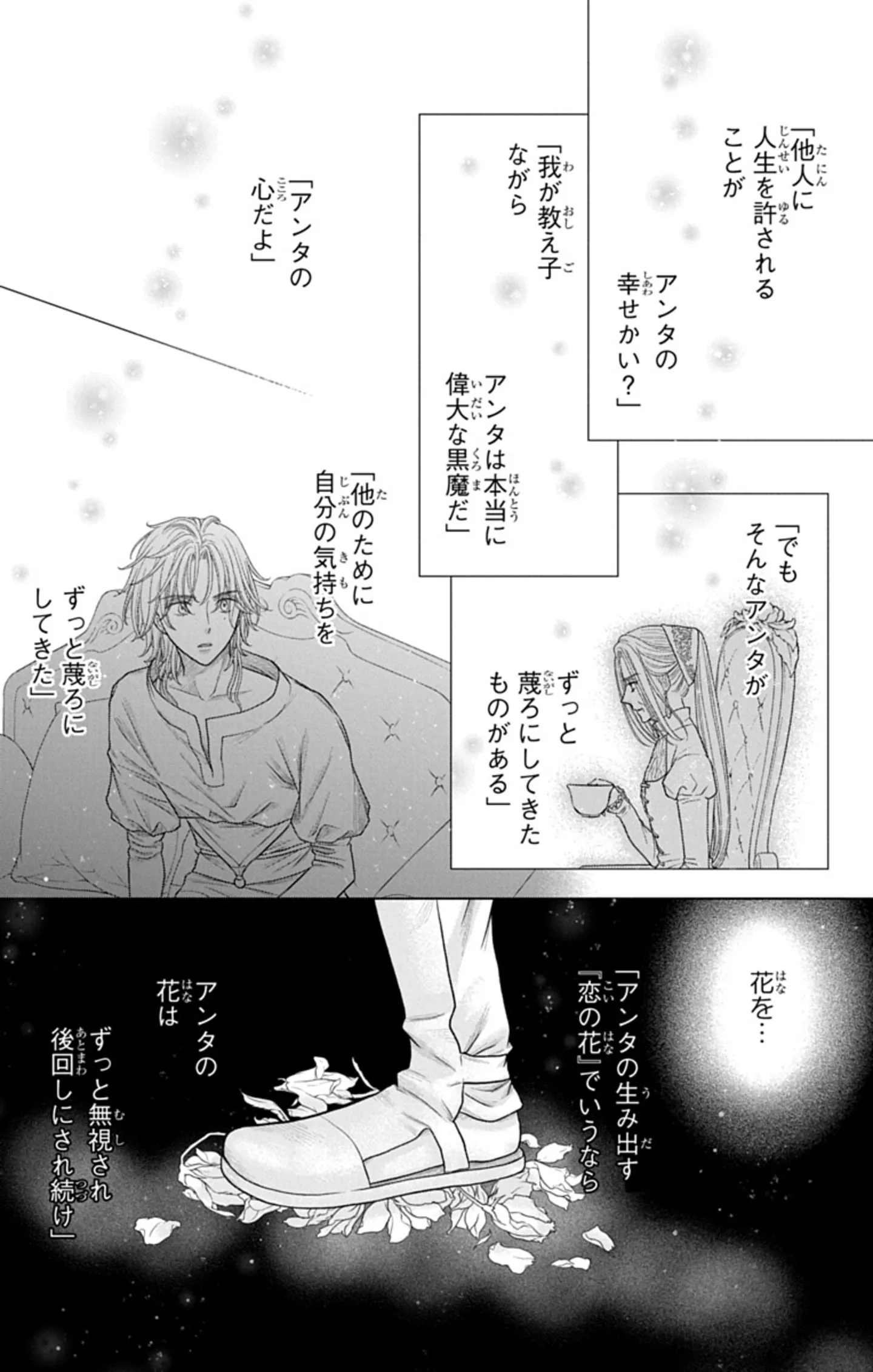 エルロイが恋に落ちた白魔法使いの王は、冷酷と噂されている一方で、エルロイの前ではとても砕けた姿で、チャーミングだ。そして、ストレートに気持ちを伝えてくる。白魔法使いらしい、愛への執着はあるが、だからこそエルロイの固く閉ざしていたはずの心の扉もこじ開けられていく。思っていたよりも、ずっと温かくて、愛情深い存在のように思える。