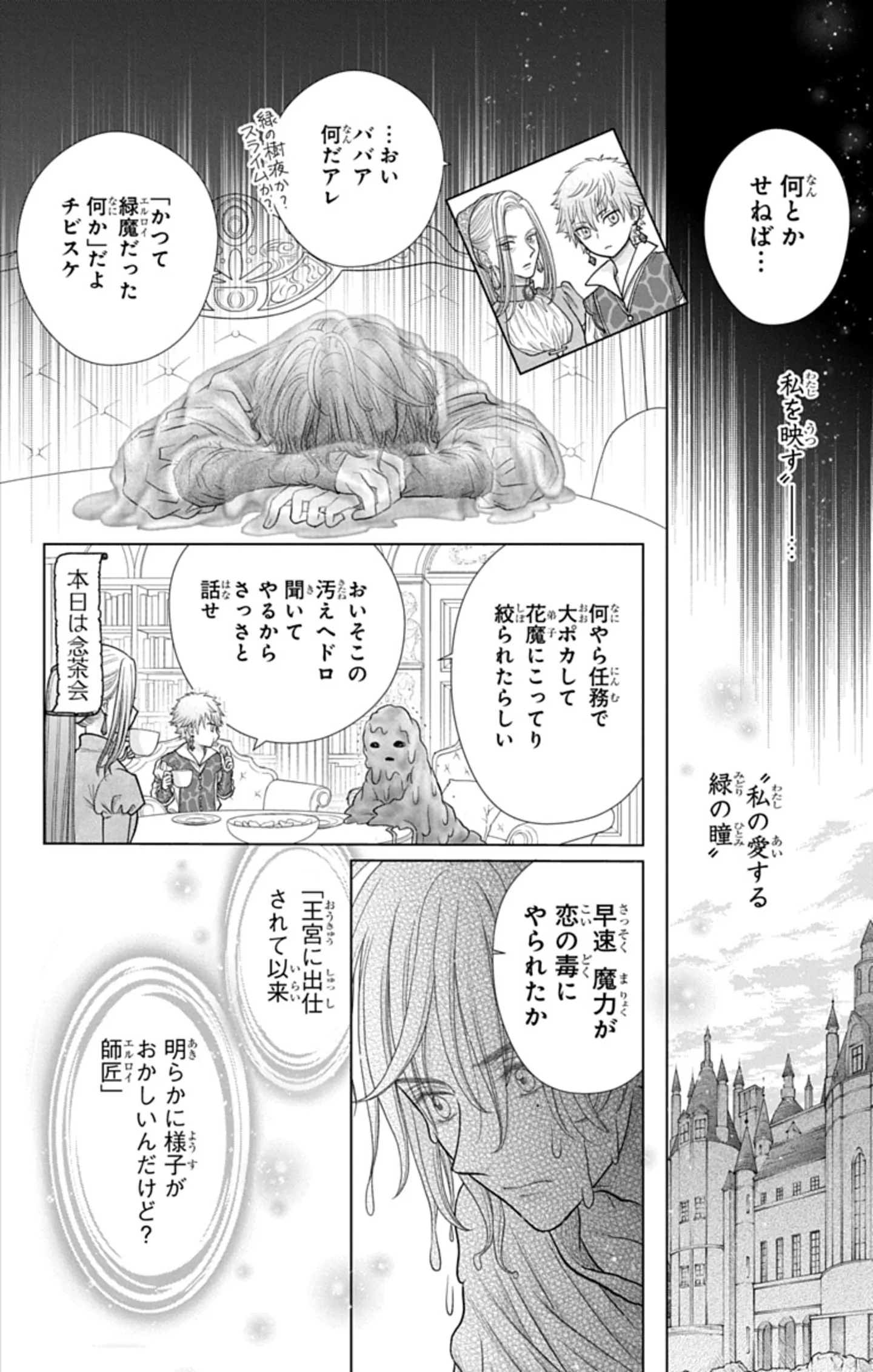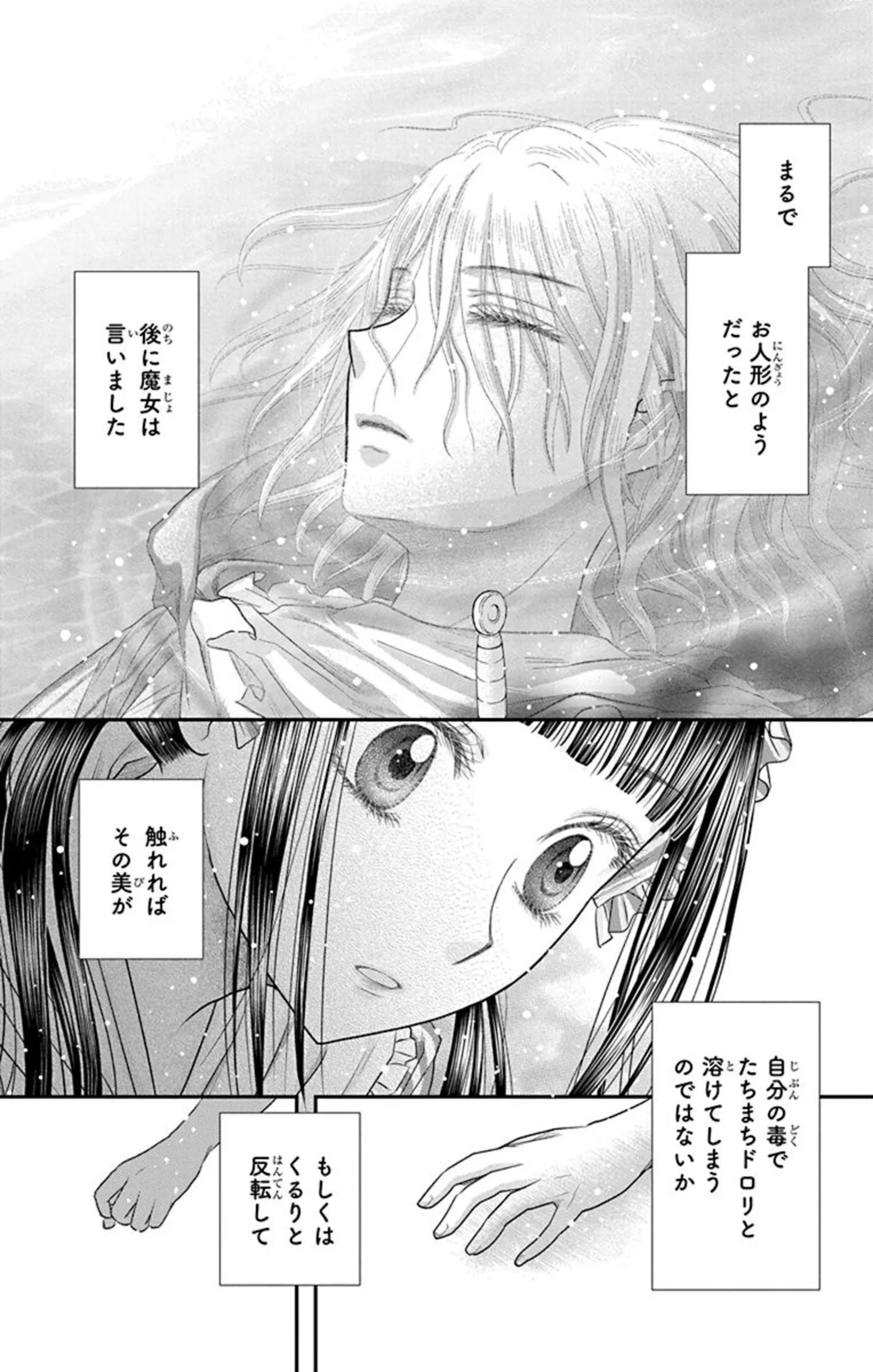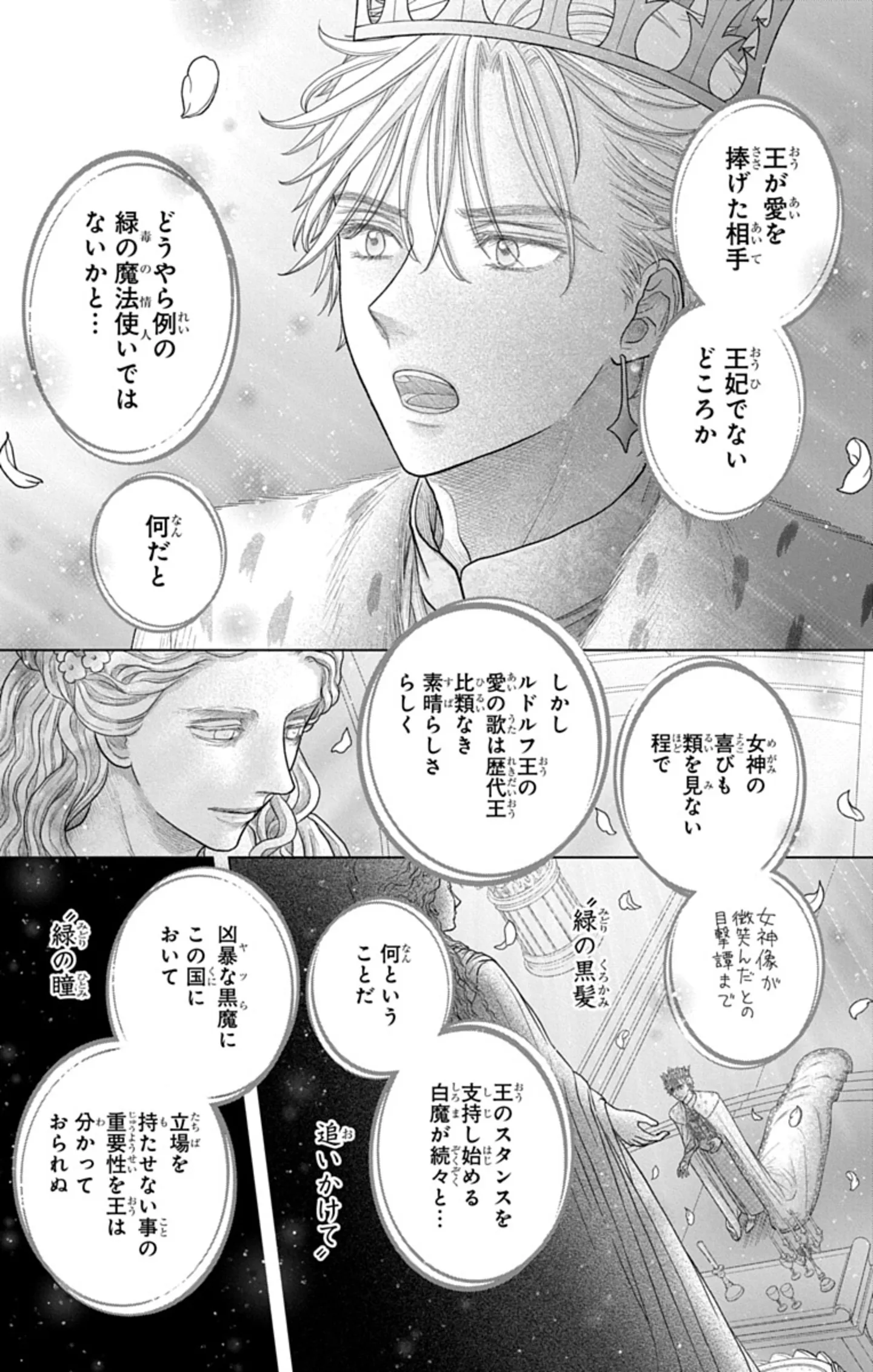 続く最新刊では、エルロイと王の恋模様が描かれる。切なくも甘いふたりの恋の行方こそが、本作を一段深いところへと導く最大の見どころだ。なぜエルロイは死ぬことになったのか。そして、リゼはどのように生まれ、育ち、あの小川に流れ着いたのか。それまでの過去が明らかになることで、白魔女たちへの印象が大きく変わってくる。
