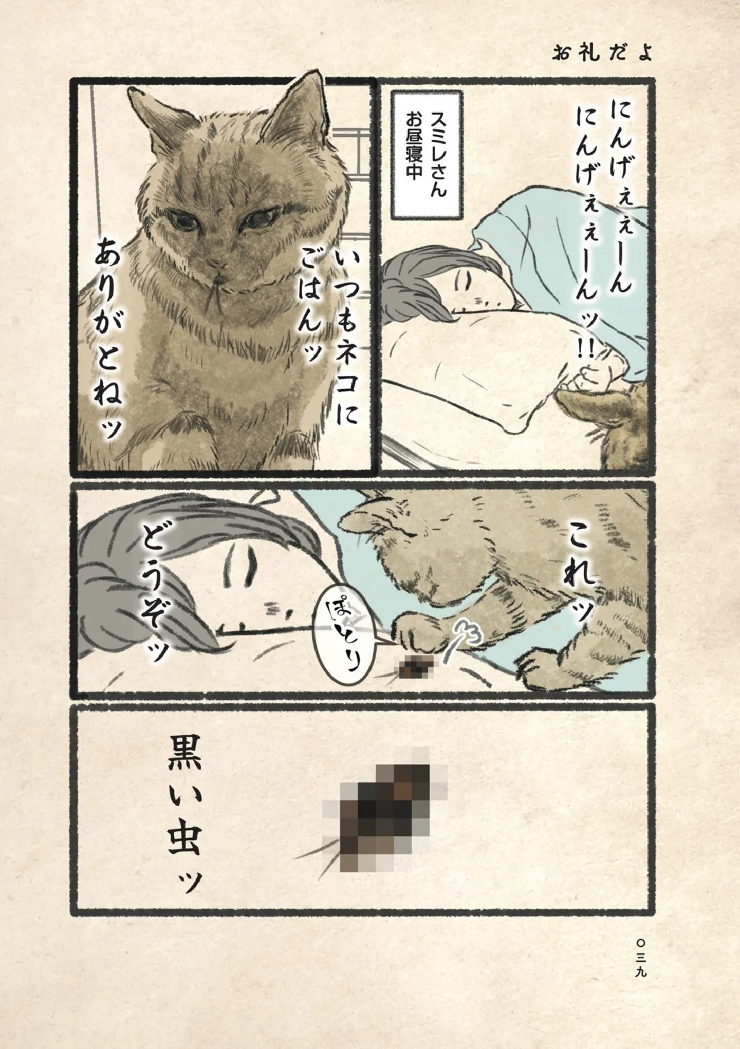 いつもご飯をくれてありがとう! 寝ている人間の横にネコ様が届けたプレゼント/今日もネコ様の圧が強い1