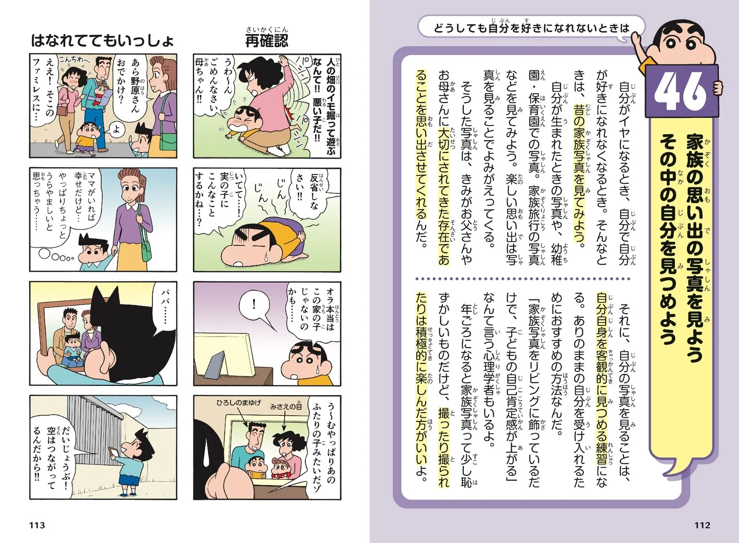 本作はクレヨンしんちゃんのマンガを楽しみながら、自分を好きになれる50のヒントを伝えてくれます。