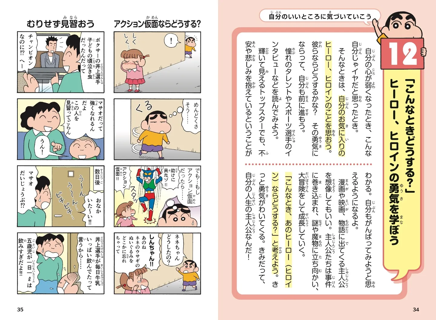 そんなしんちゃんたちが子どもたちに生きる上で大切なことを教えてくれるのが「先生は教えてくれない!」シリーズ。10冊目となる最新刊のテーマは「自分を好きになる」です(『先生は教えてくれない! クレヨンしんちゃんの自分をもっと好きになる本』《臼井儀人:キャラクター原作、高田ミレイ:まんが/双葉社》)。