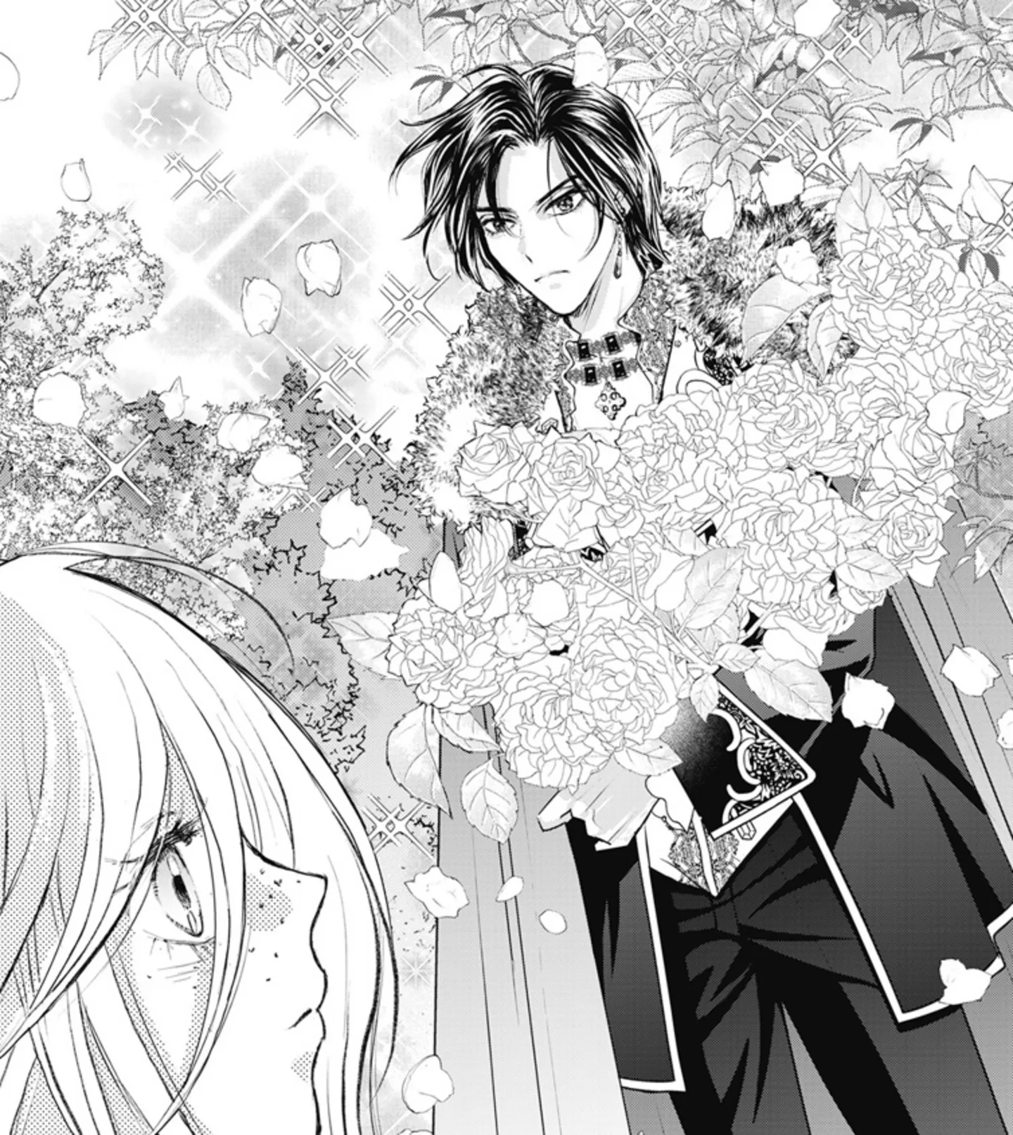 酒井:昔読んでいた少女漫画では、ヒロインや相手役が登場するとき、必ず花がいっぱい描かれていて。池田理代子先生の『ベルサイユのばら』もそうですね。だから自分も少女漫画の常識として、背後に花をつけています。八重の花が好きなので、薔薇はよく描きますね。