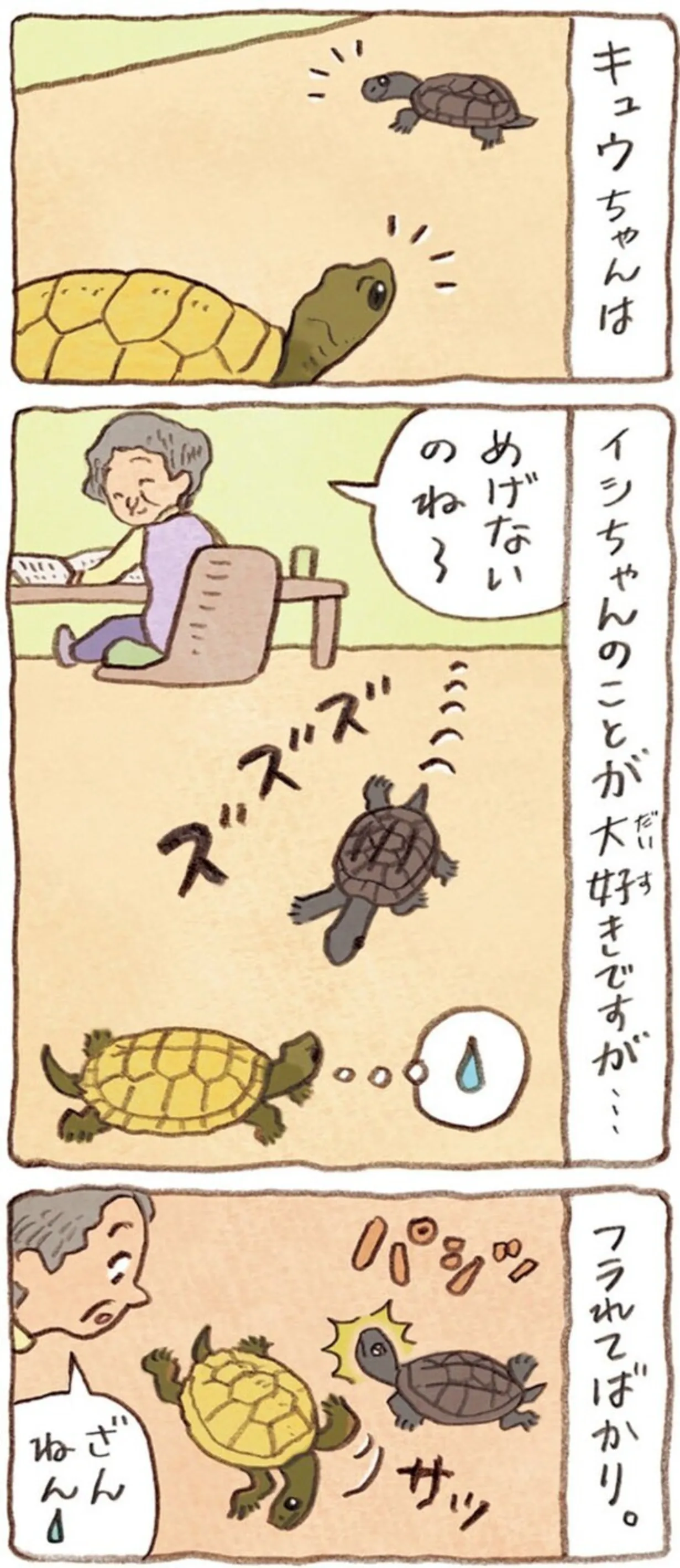 おばあちゃんと暮らす2匹のかめはどちらも個性的。部屋を歩きまわる2匹の様子は…/おばあちゃんとかめ マンガ 公開日:2026/2/15 この連載を最初から読む→ <第3回に続く> 本作品をAmazon(電子)で読む > 本作品をRenta!で読む > 本作品をebookjapanで読む > 本作品をBOOK☆WALKERで読む > « 1 2 3 あわせて読みたい 【漫画】『おばあちゃんとかめ 何げに楽しい2匹とのくらし』を第1回から読む 【漫画】『痔だと思ったら大腸がんステージ4でした 標準治療を旅と漫画で乗り越えてなんとか経過観察になるまで』を読む 【漫画】『飼い猫がなつきません 』を読む 【漫画】『彼とねこが待っている。』を読む 【漫画】『ねこようかい』を読む 最新マンガと話題の書籍を無料で試し読み! 前の回 一覧 人気の連載 次の回 おばあちゃんとかめ 何げに楽しい2匹とのくらし (コミックエッセイ) 試し読み *電子書籍ストアBOOK☆WALKERへ移動します