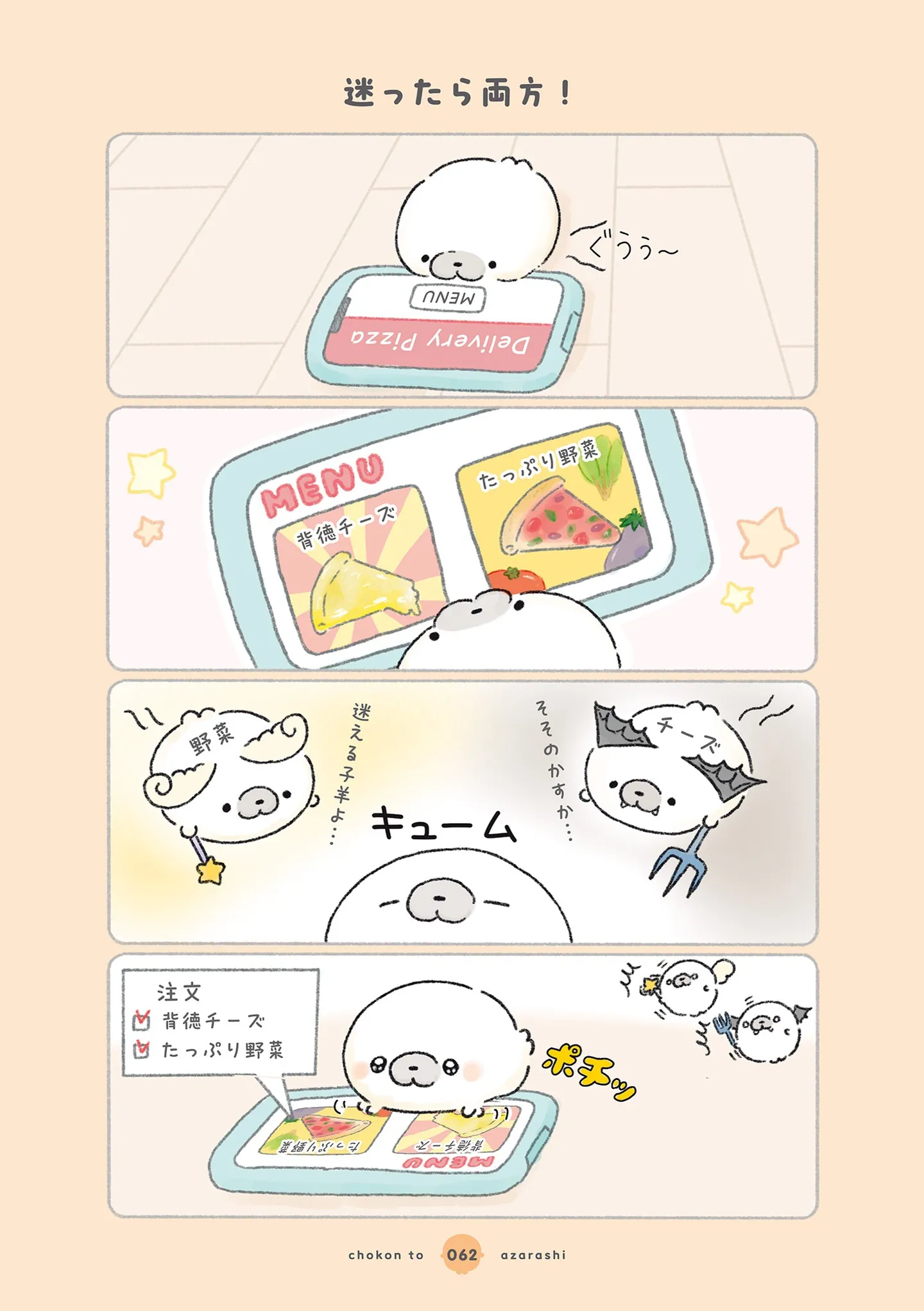 どっちのメニューにしよう? レストランで迷ったあざらしが大胆決断/ちょこんとあざらし⑦ マンガ 公開日:2026/2/13 この連載を最初から読む→ <第8回に続く> 本作品をAmazon(電子)で読む > 本作品をRenta!で読む > 本作品をebookjapanで読む > 本作品をBOOK☆WALKERで読む > « 1 2 あわせて読みたい 【漫画】『ちょこんとあざらし』を第1回から読む 【漫画】『永久機関シマエナガ』を読む 【漫画】『娘をグルーミングする先生』を読む 最新マンガと話題の書籍を無料で試し読み! 前の回 一覧 人気の連載 次の回 ちょこんとあざらし (コミックエッセイ) 試し読み *電子書籍ストアBOOK☆WALKERへ移動します