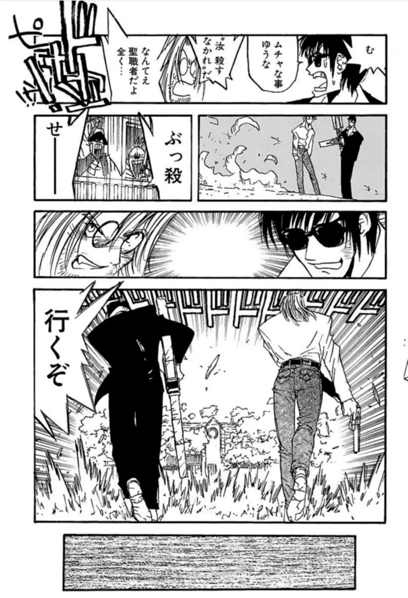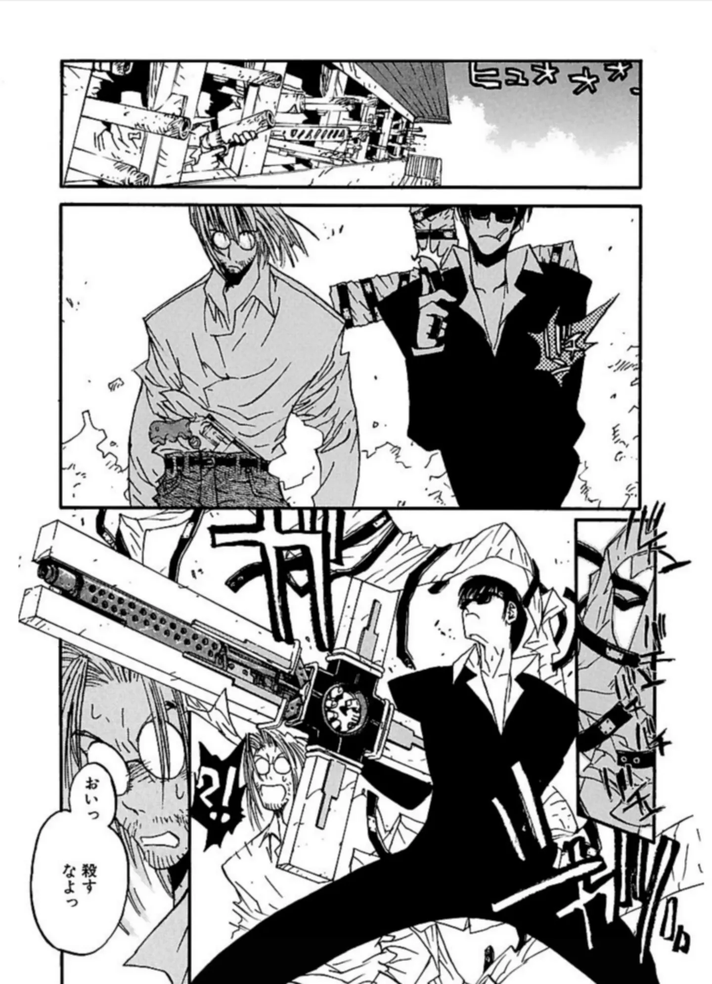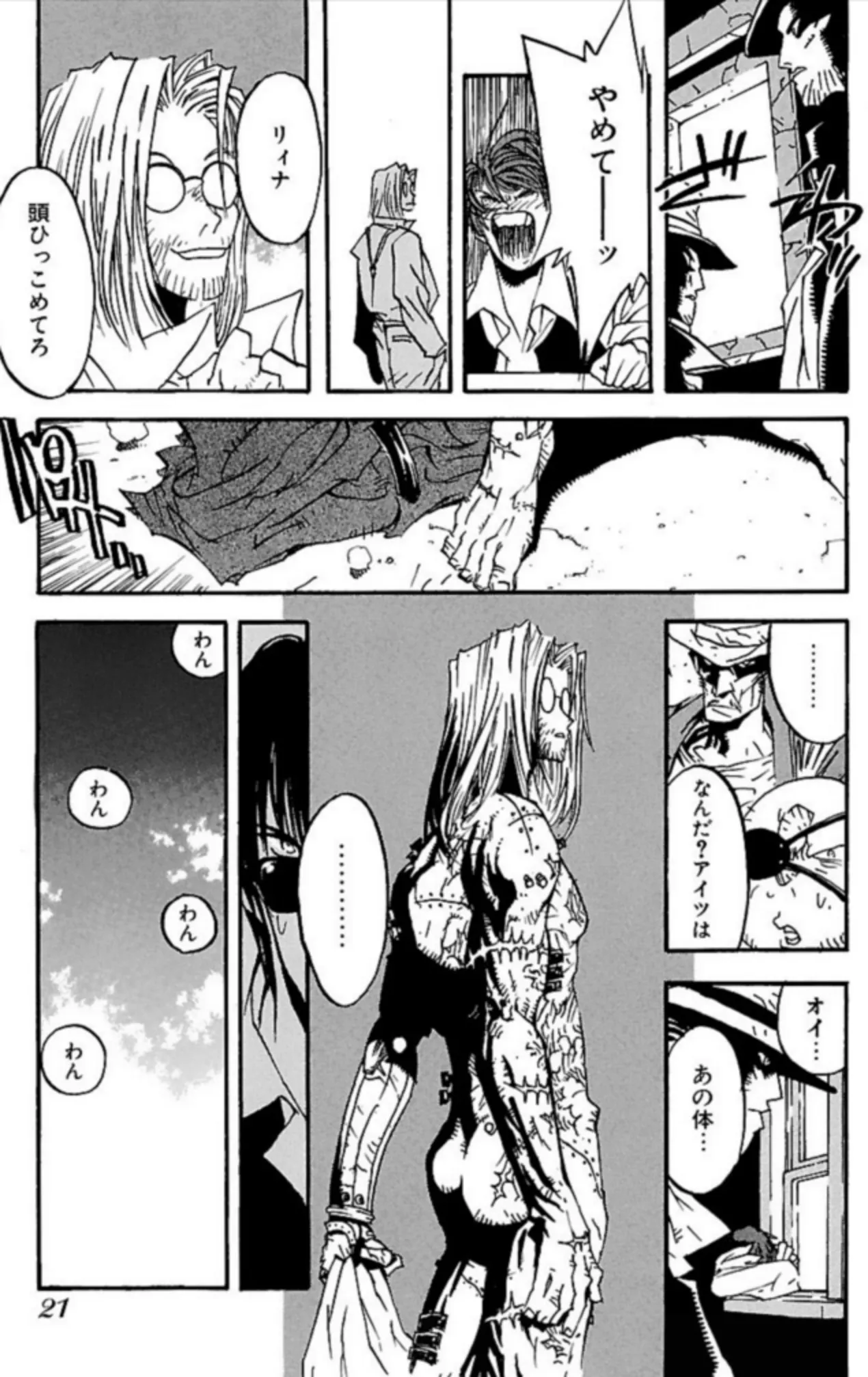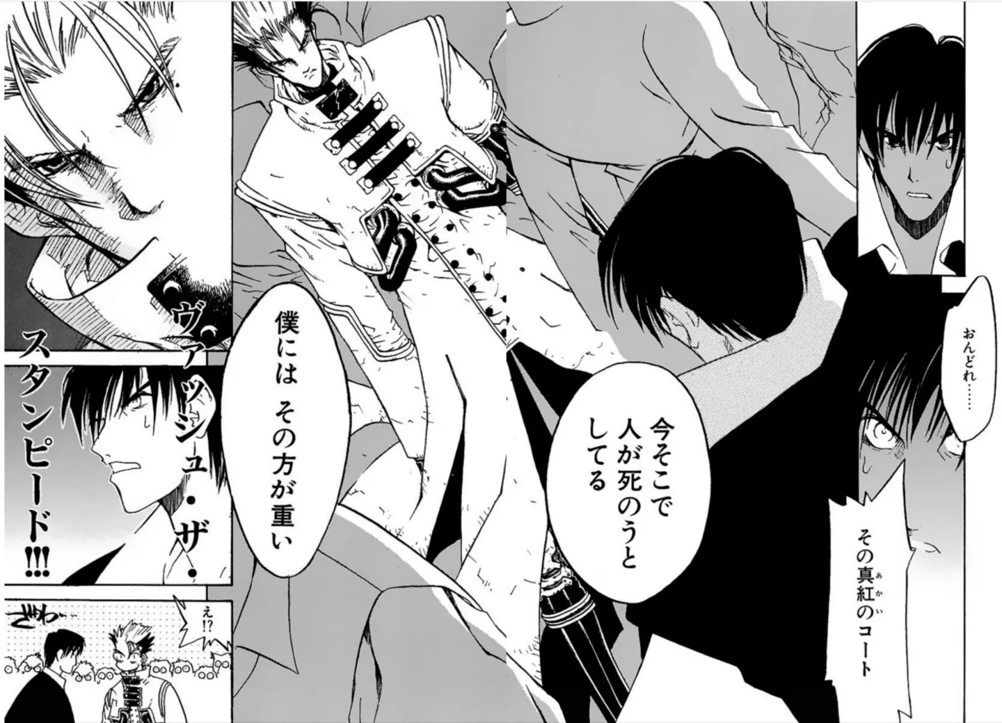 本作の大きな見どころのひとつは、言うまでもなくガンアクションである。大胆な構図や迫力ある見開き、手に汗握る銃撃戦の描写は、まさに一瞬の油断も許されない攻防の連続だ。特に第5巻以降、ミリオンズ・ナイブズと前述の「GUNG-HO-GUNS」との戦いが本格化し、バトルシーンのアツさが加速していく。その戦闘の中心となるのが、ヴァッシュと、そしてウルフウッドである。