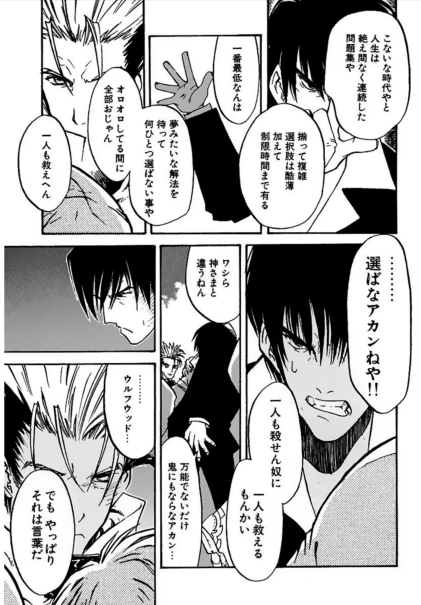 二人は名バディとなっていくが、根本的に相容れない部分がある。「不殺」を貫くヴァッシュと、「神に祈り悪を裁くためには殺しも辞さない」ウルフウッドは、常に対立構造のバディなのだ。共闘するなかで、ウルフウッドはヴァッシュの戦う覚悟に触れ、ヴァッシュはウルフウッドの現実的な言葉に揺さぶられる。理想と現実、その対立をどのように描ききるのか。