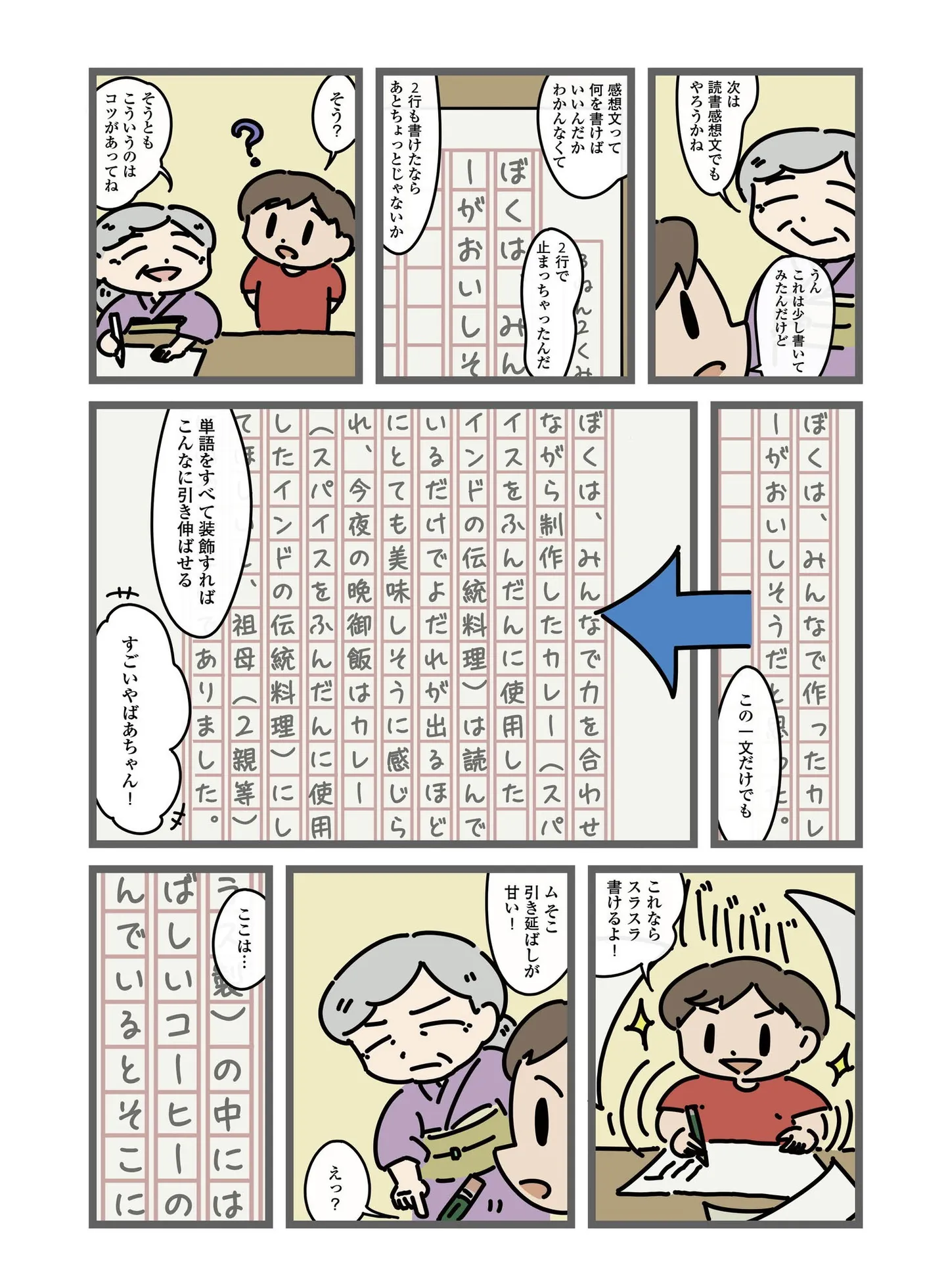 その後、きよしは読書感想文の極意をおばあちゃんに仕込まれます。その手法とは単語を装飾しまくって文章を引き延ばす、というもの。カレーという単語が出てくれば括弧でくくって「スパイスをふんだんに使用したインドの伝統料理」と書いて文字数を稼ぎます。