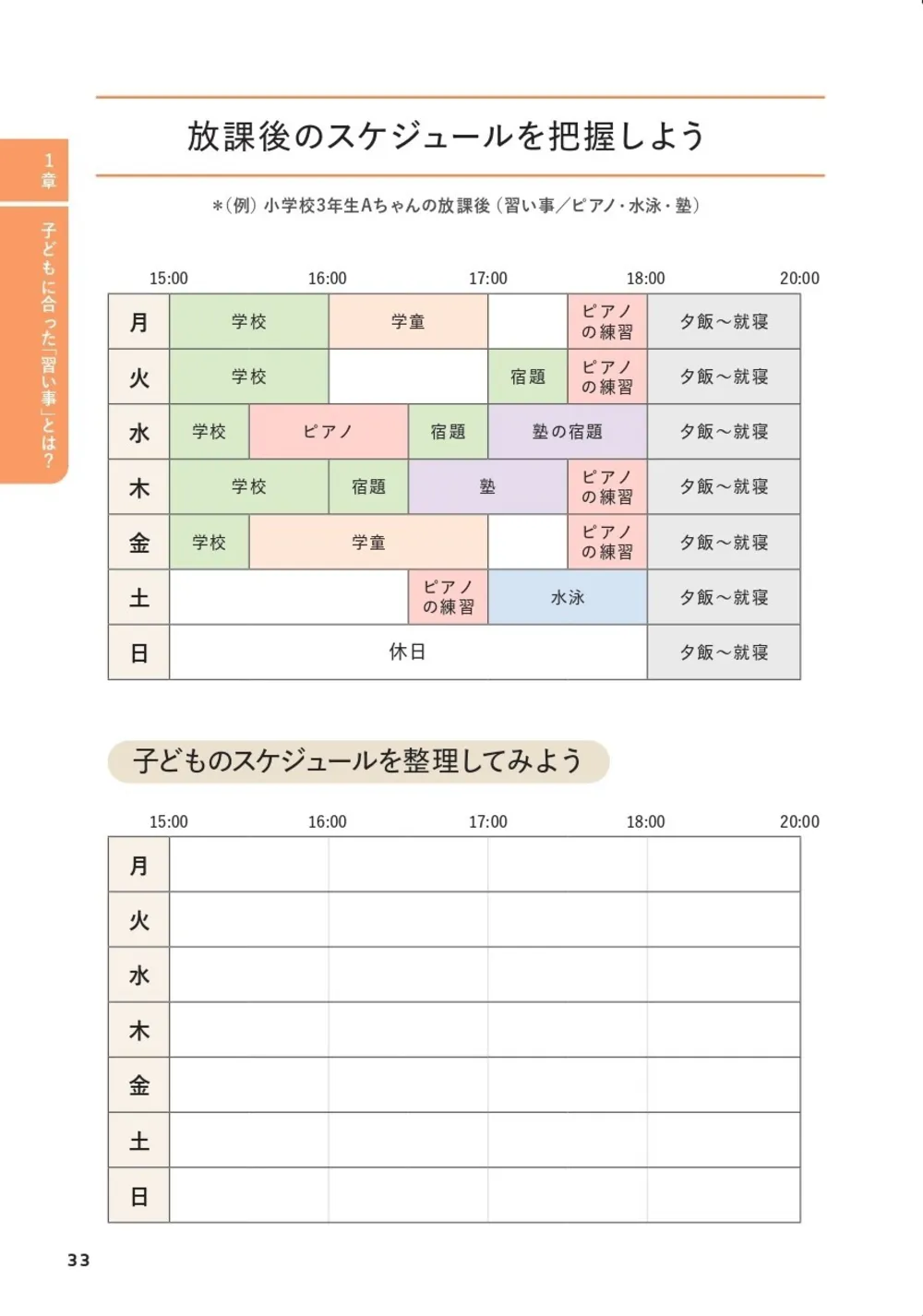 本書は保護者の質問に答えるQ&Aコーナーもあり、「時間・スケジュールに関する悩み」「指導者・教室に関する悩み」など3つのテーマ別に40件以上の質問に答えています。我が家の長男はなんでもやりたい&続けたいタイプで、放課後はパンク状態。このまま全部続けていいのか悩んでいたのですが、そのような悩みに本書は、スケジュール表を作って「見える化」することをおすすめしています。我が家も実際にスケジュールを作ってみたところ、家でやる「おさらい」や「練習」など見落としがちな時間も含めて考えることができました。