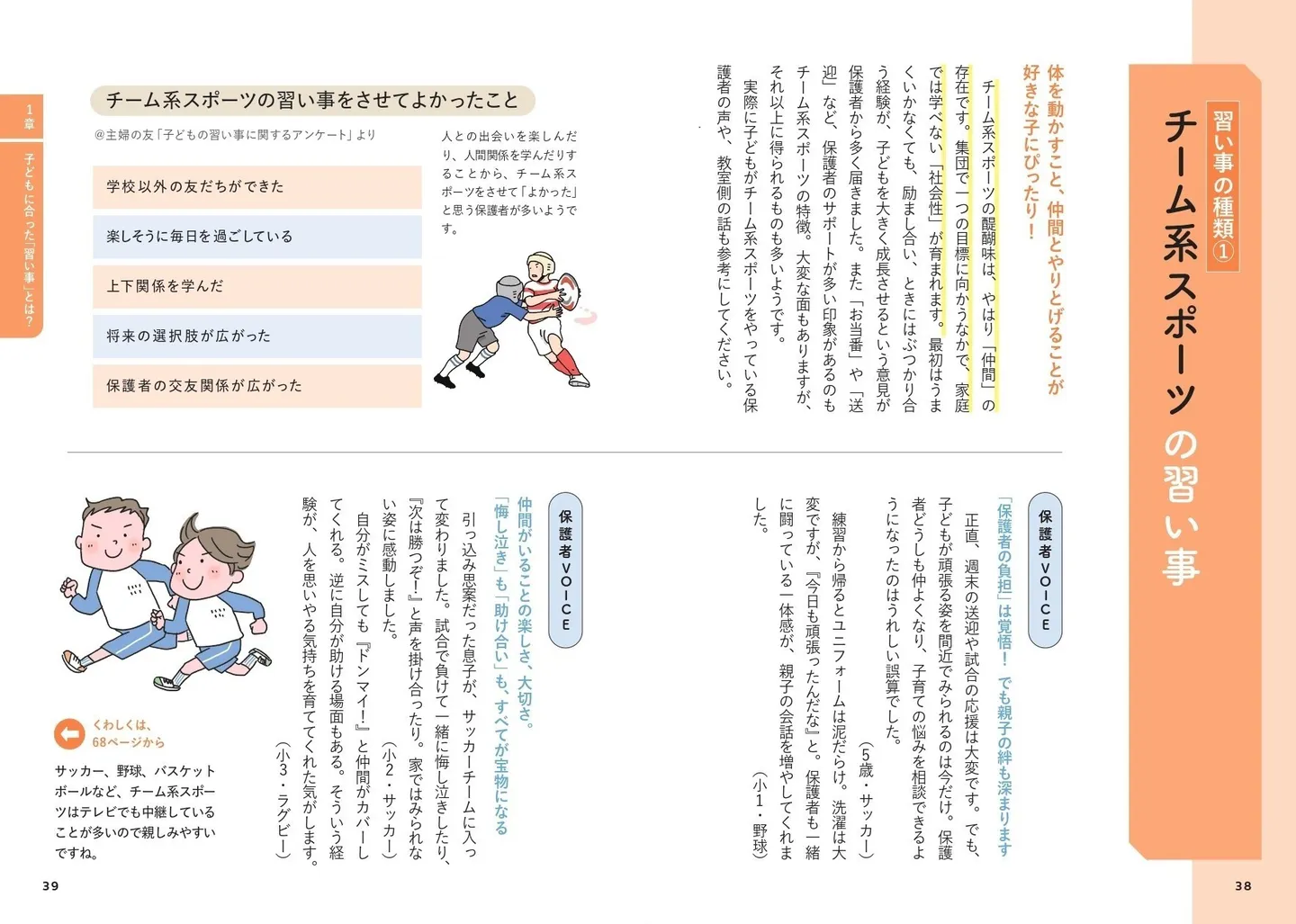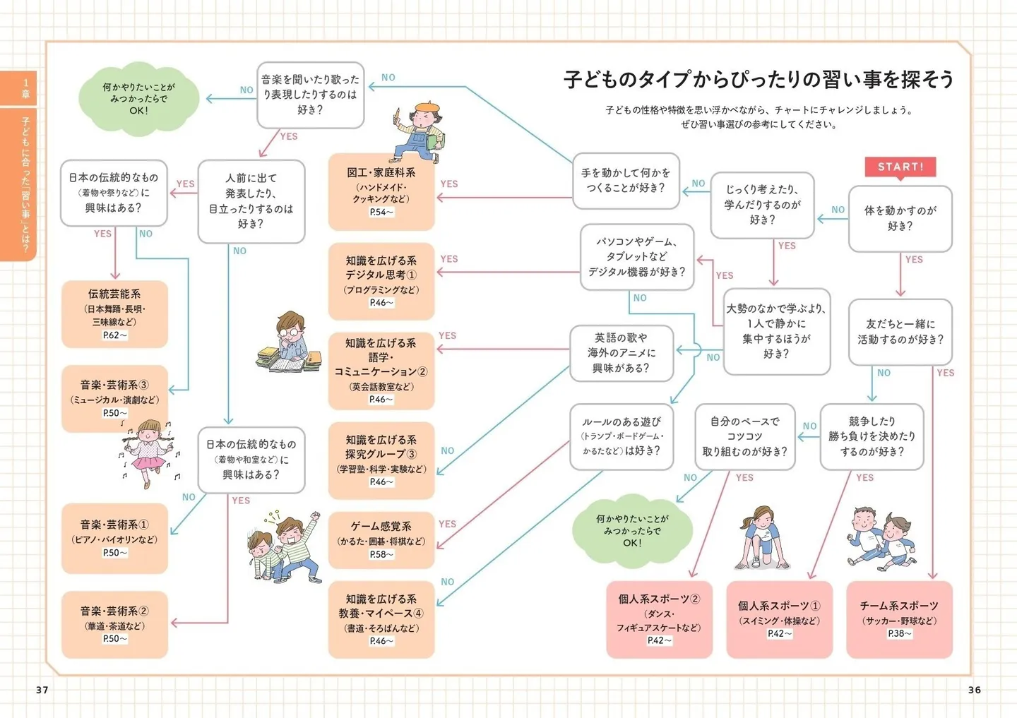 では、自分の子どもが“やりたい”と感じる習い事はなんなのか? フローチャートを使って「自分の子どもにはどんな習い事がいいか?」を考えることができます。本書では、「チーム系スポーツ」「知識を広げる系」「音楽・芸術系」など13の習い事の種類を紹介。
