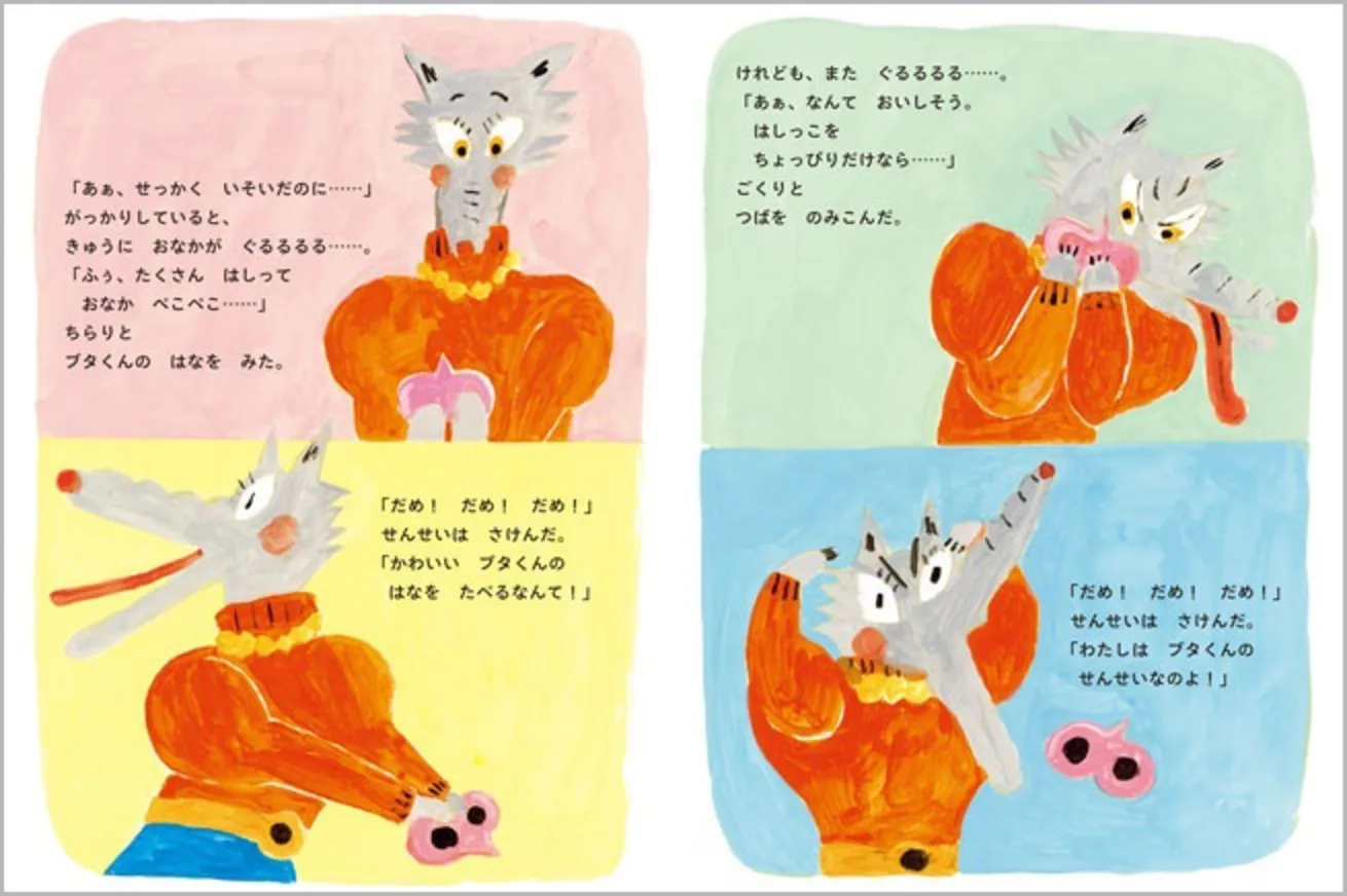 「たいへん たいへん!」必死でかけ回るオオカミ先生は、ブタくんを無事に助け出せるのでしょうか?