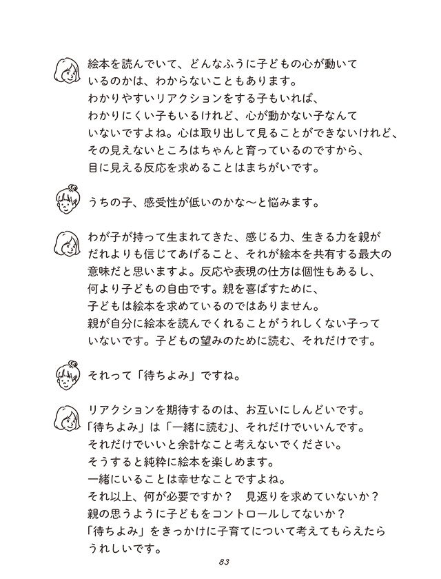 「絵本を読むと頭がよくなる」「冊数は多ければ多いほどいい」「絵本と体験を結びつけると尚よい」などの考え方も、特に必要ないと語ります。絵本を読むことは、知識や教養ではなく、子どもに愛情を示し続けること。まずは1冊を繰り返し読むだけでもよく、見返りを求める必要もない。